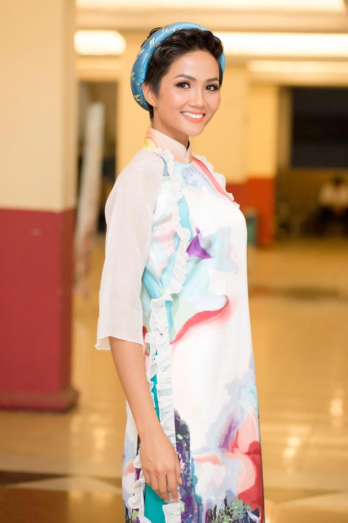 Vào sáng 23/1, thực hiện lời hứa lúc đăng quang, Hoa hậu H'Hen Niê đã trở về quê hương và trao học bổng cho học sinh có hoàn cảnh khó khăn tại những ngôi trường cô từng theo học. Cô chọn tà áo dài trắng thanh lịch họa tiết hoa sen để mặc.