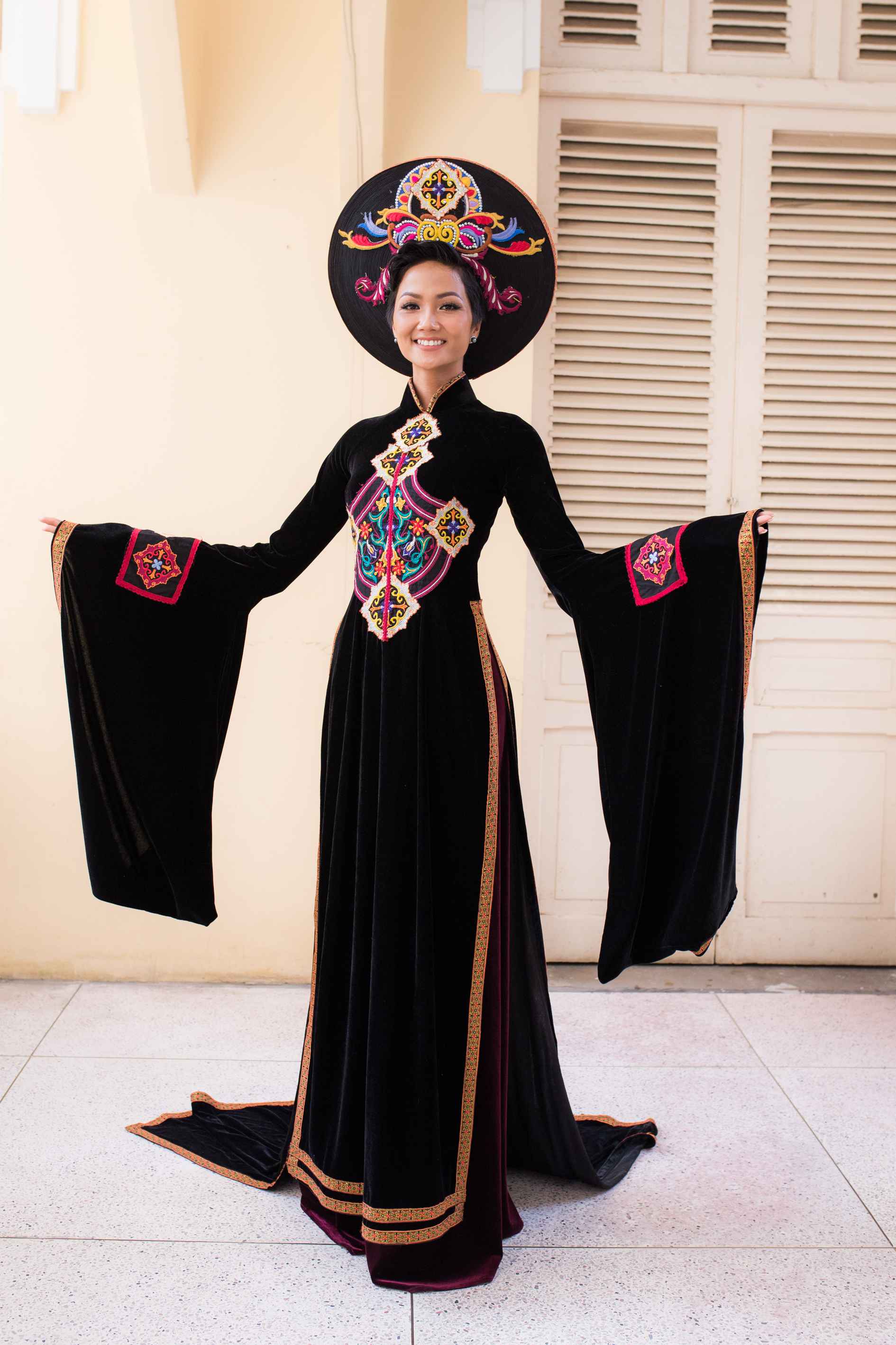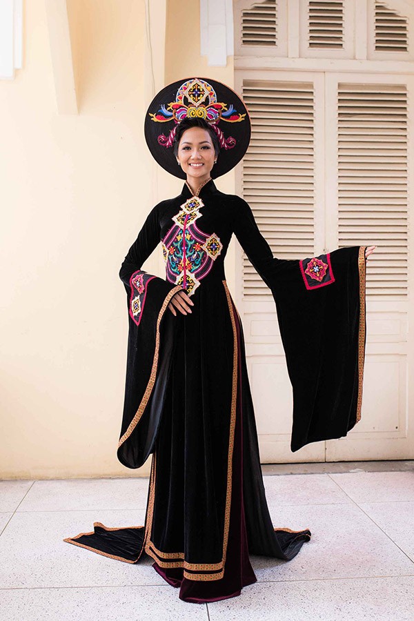 Tham gia tặng áo dài cho các nữ biệt động Sài Gòn vào ngày 26/1 tại Bảo tàng Phụ nữ Nam Bộ (TP.HCM), Hoa hậu Hoàn vũ H'Hen Niê chọn mặc tà áo dài màu đen sang trọng.