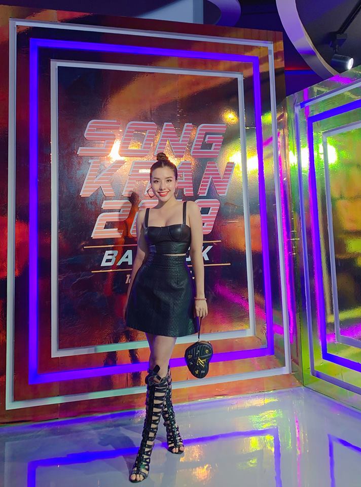 Ban ngày vui vẻ tạt nước, buổi tối, Khánh Phương lại chọn cho mình set đồ gồm áo croptop và chân váy da để tạo sự ấn tượng, thu hút pha chút gợi cảm, phóng khoáng.
