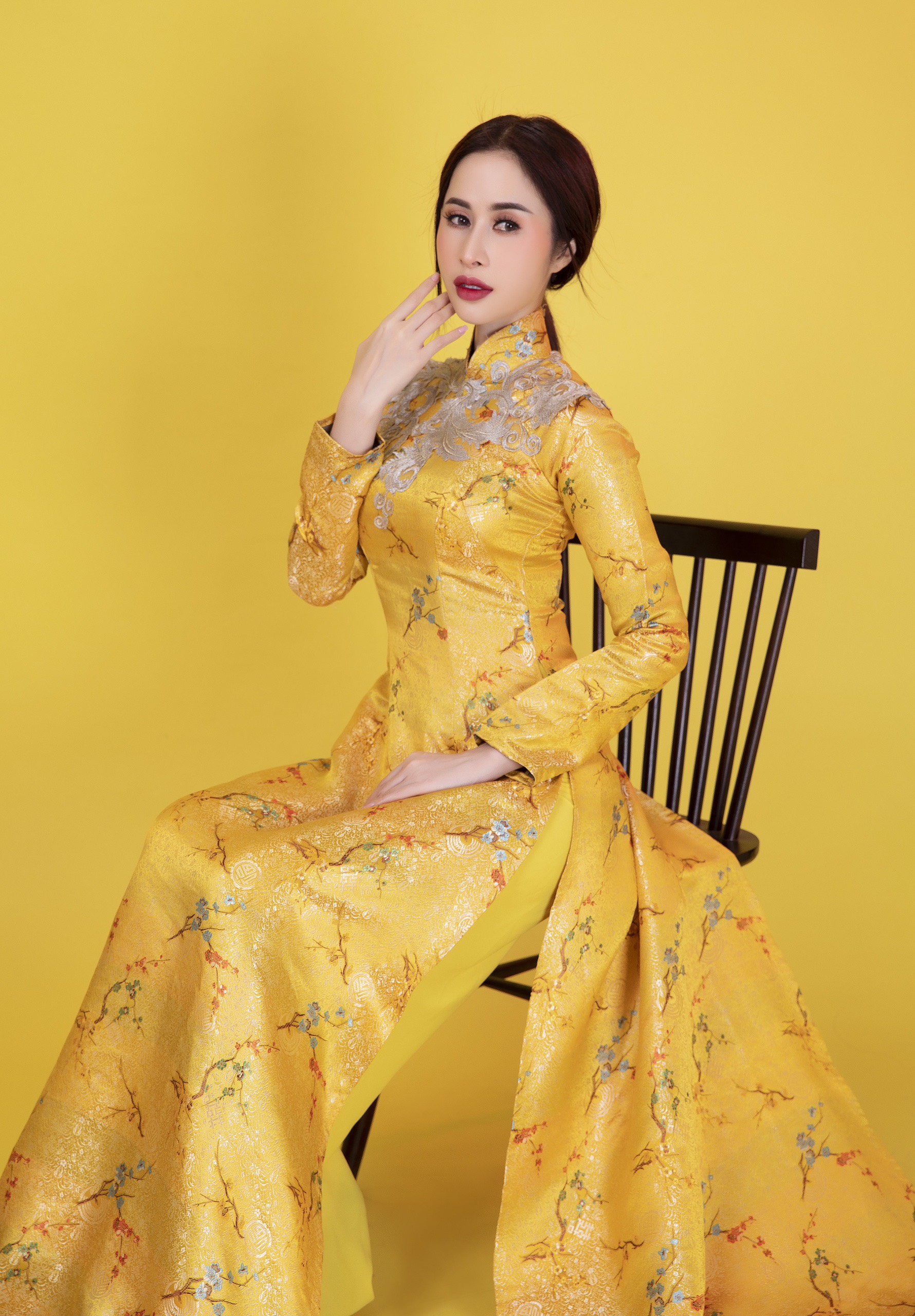 Tà áo dài vàng như sắc hoa mai tưởng chừng quá rực rỡ lại được cân bằng nhờ kiểu tóc cột gọn, nhưng lại có phần tóc con nhẹ nhàng và rất thơ. Cách trang điểm nhấn vào đôi môi cũng giup đem lại hình ảnh phù hợp.