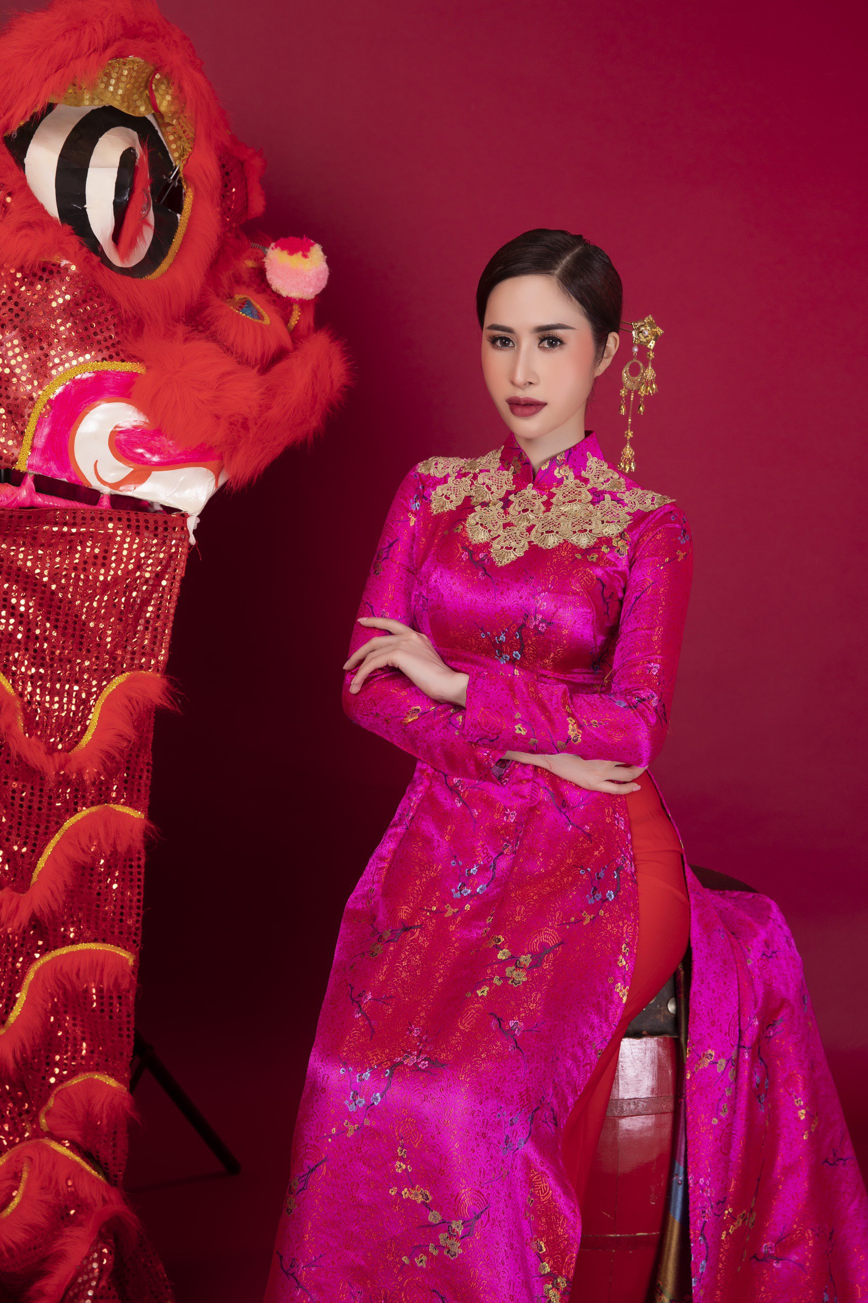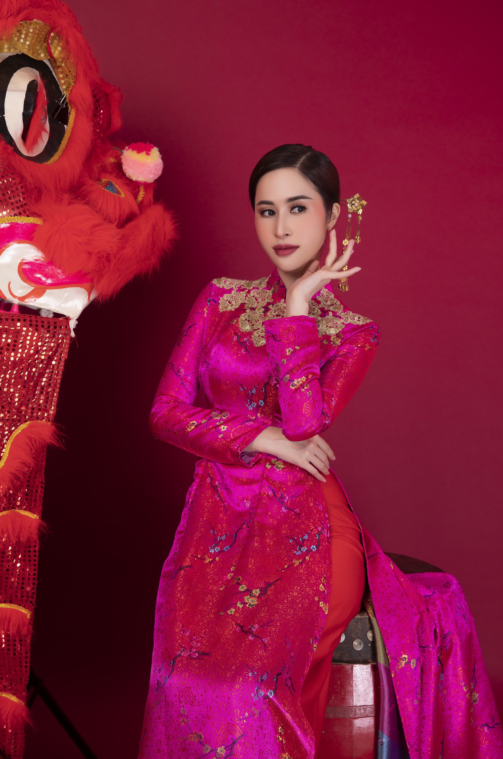 Với tà áo dài đỏ, Ngọc Hân để kiểu tóc búi gọn cùng phụ kiện trâm cài, đem lại nét đài các, thanh tân.