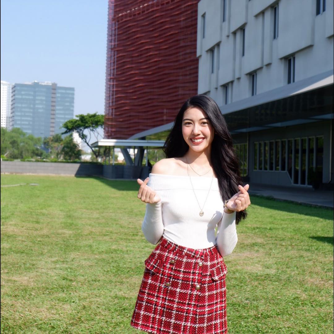Rũ bỏ dáng vẻ sang chảnh, á hậu Thúy Vân tươi tắn, trẻ trung hết mức cùng combo áo trễ vai và chân váy sọc đỏ nổi bật.