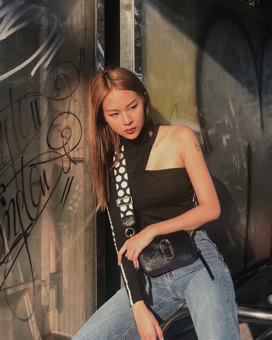 Không cần nhiều màu sắc quá nổi bật, cặp màu đơn sắc cùng áo lệch vai và túi đeo chéo đã đủ giúp Phí Phương Anh ghi điểm thời thượng rồi.