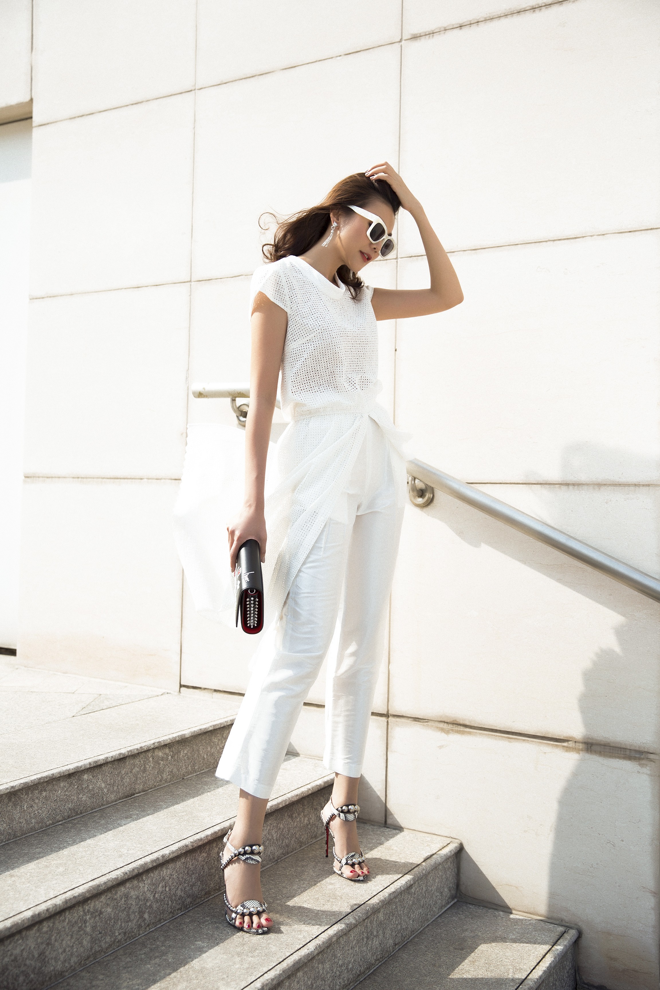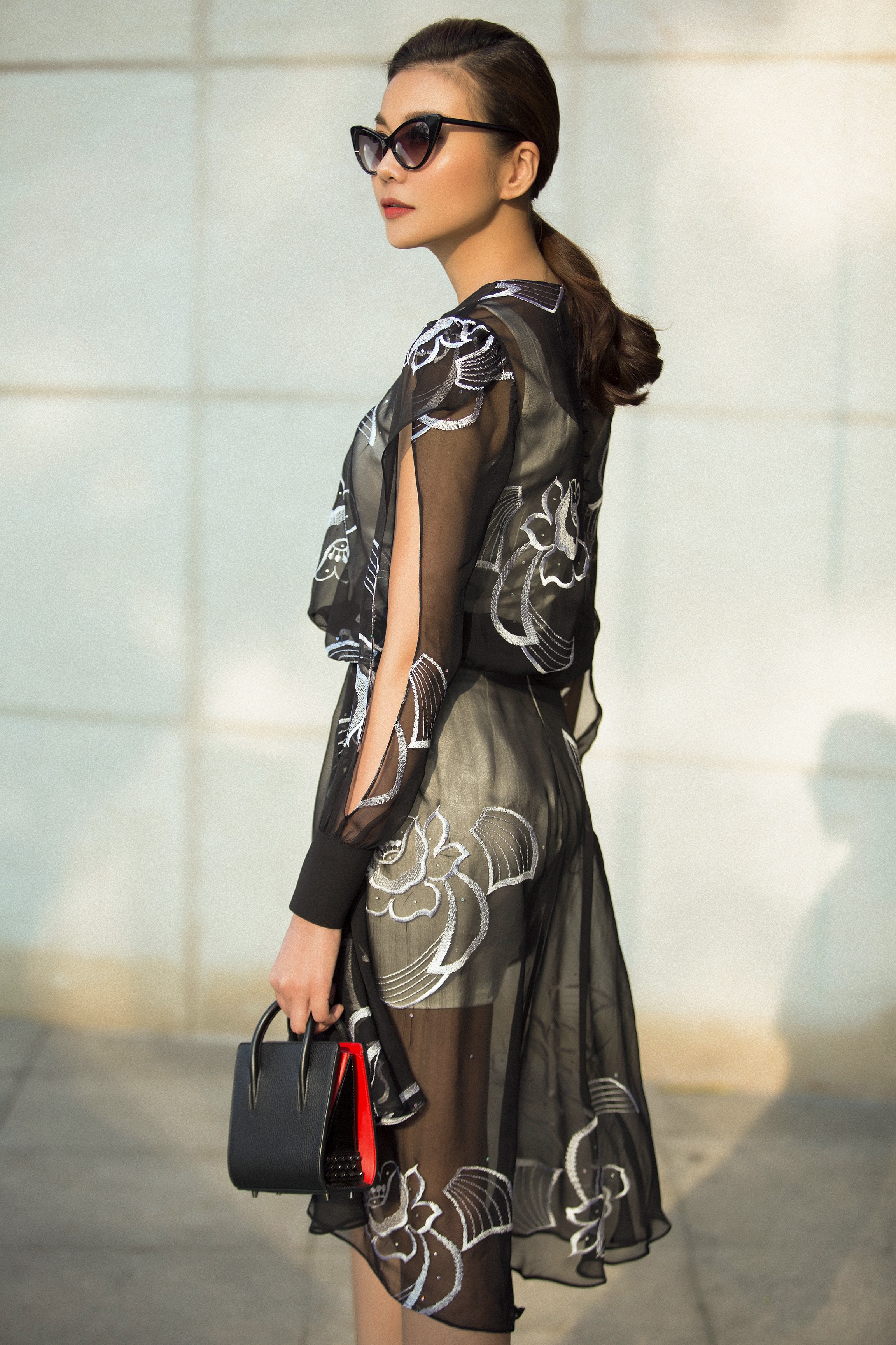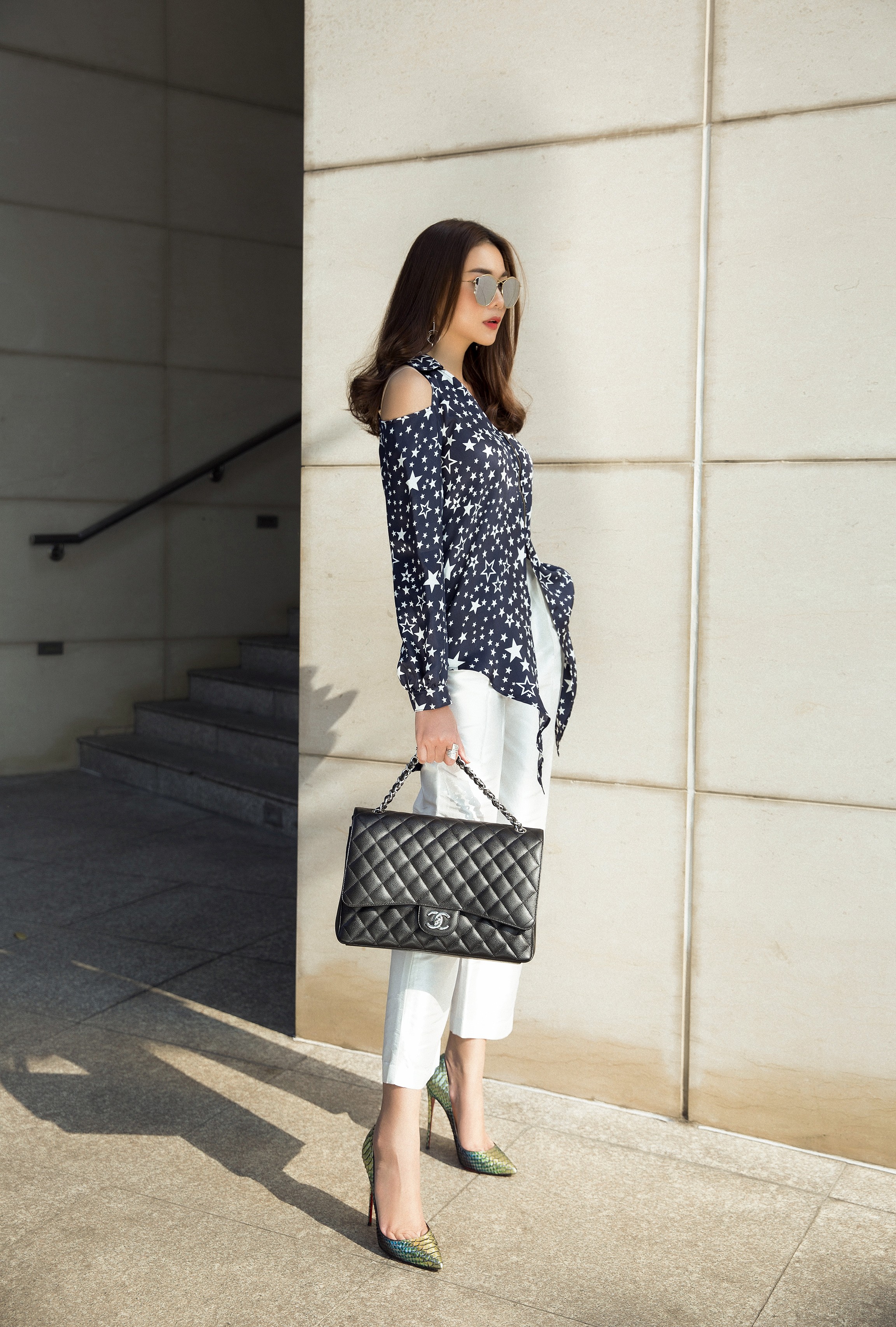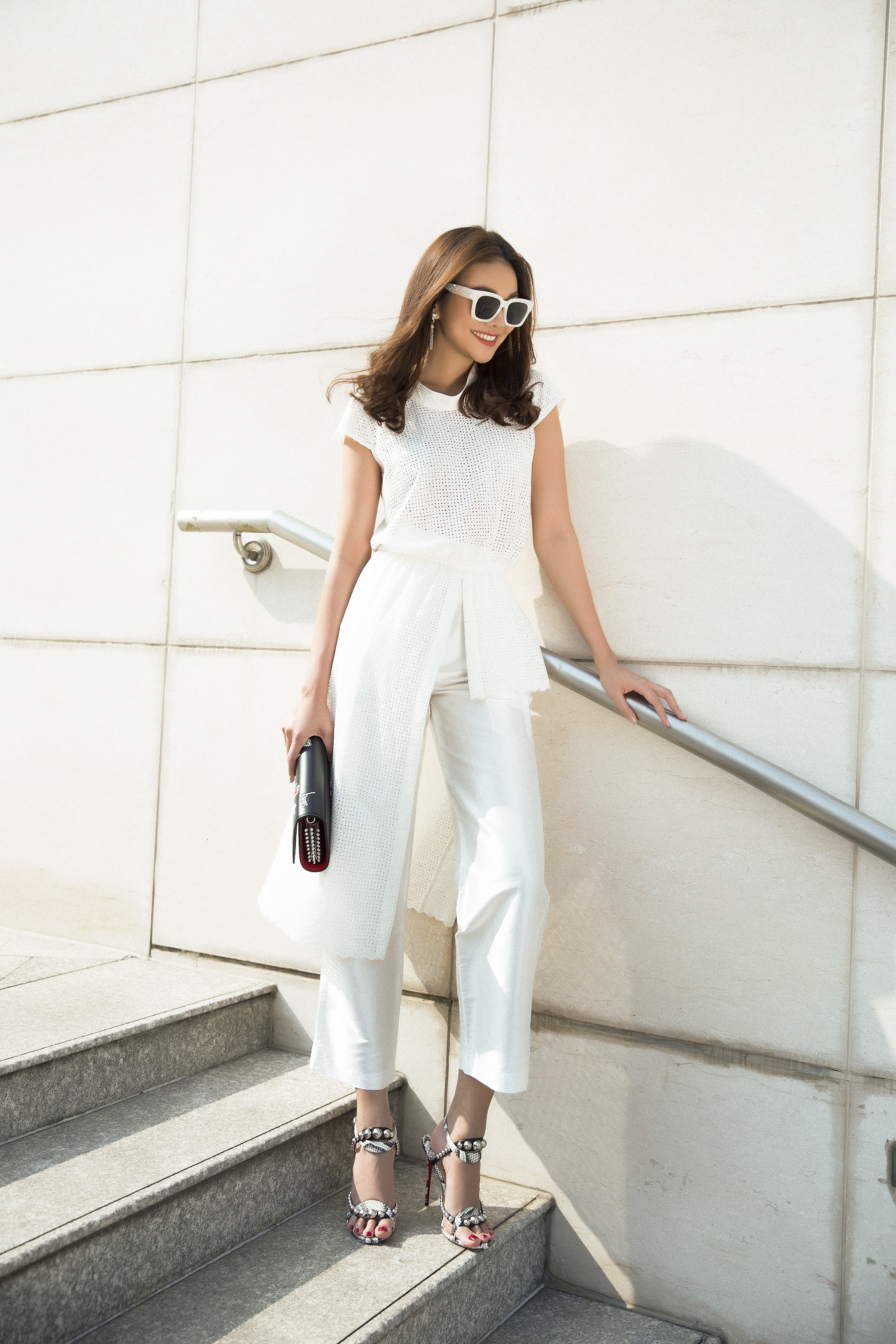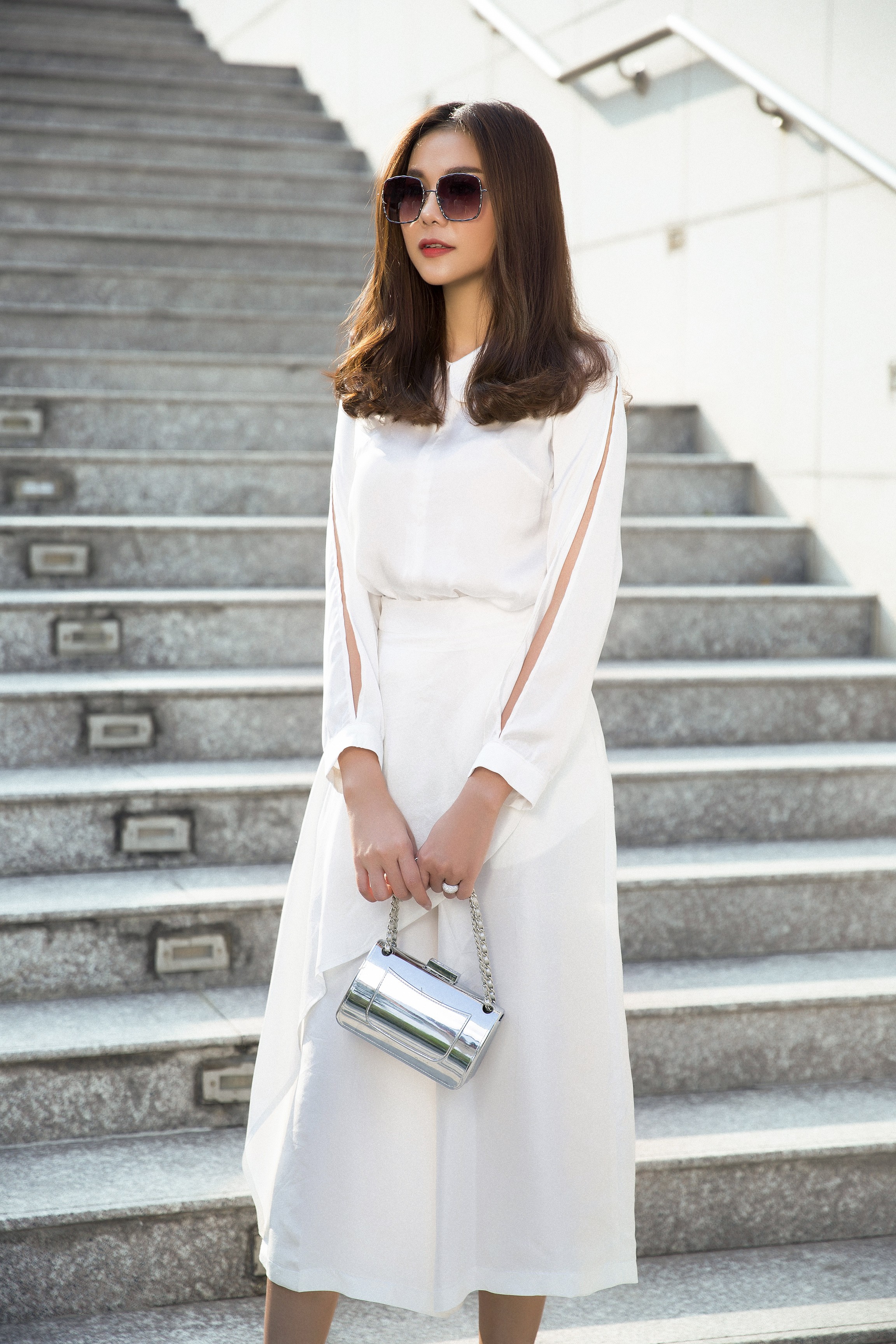 Chiếc kính tráng gương với thiết kế độc đáo cùng ví cầm tay là điểm nhấn đơn giản nhưng vẫn giúp Thanh Hằng tỏa sáng.