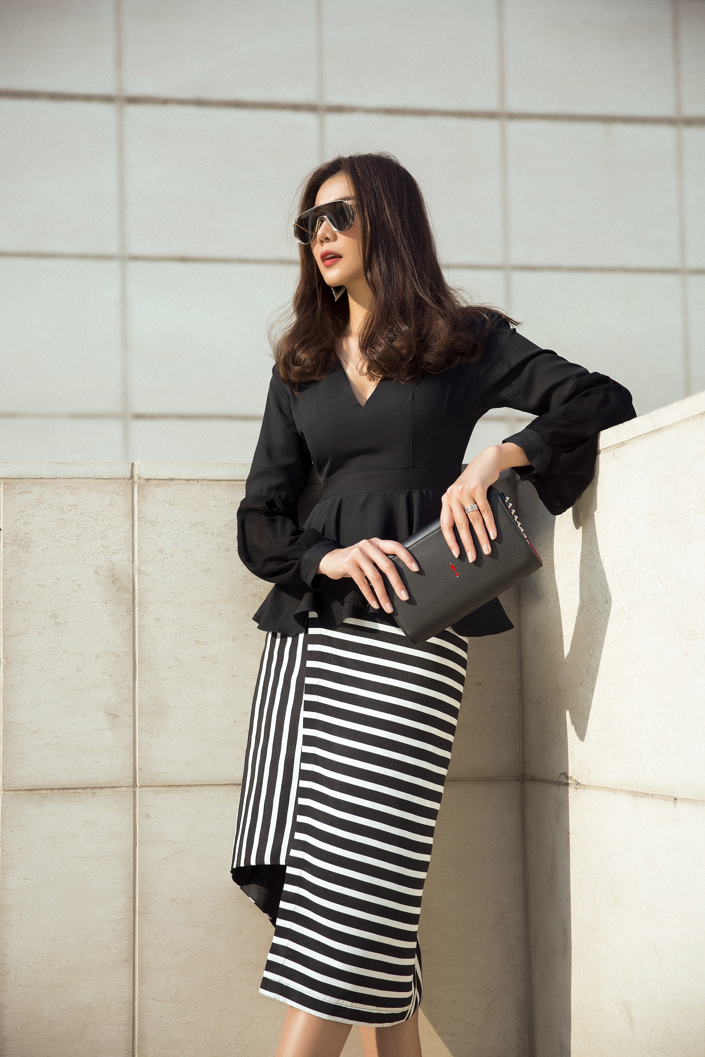 Bắt kịp trend thế giới, Thanh Hằng chọn chiếc váy với họa tiết kẻ sọc để hoàn thiện set đồ mang hơi hướng công sở, vừa không gây nhàm chán lại vừa thể hiện sự sành điệu tức thời của siêu mâu.