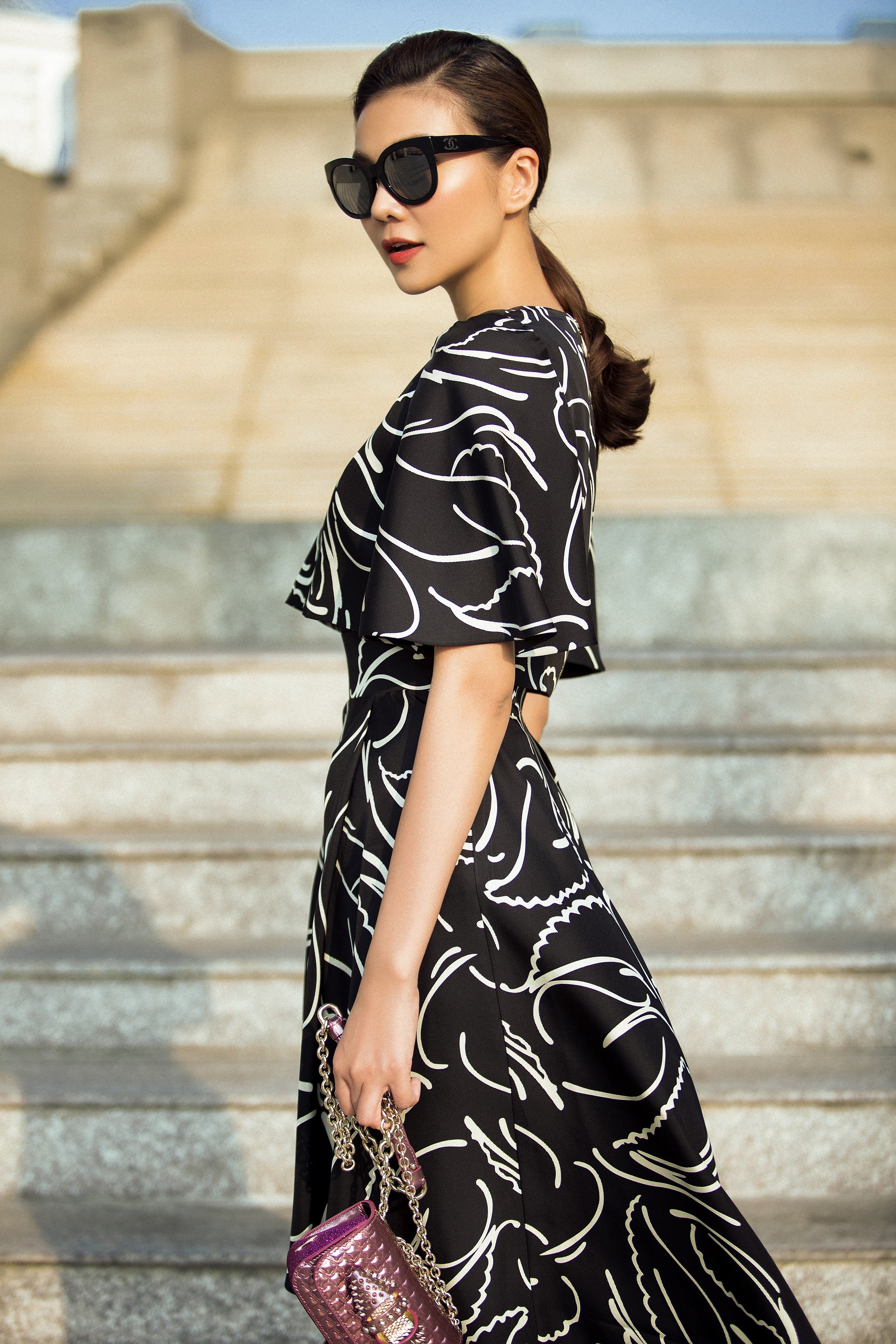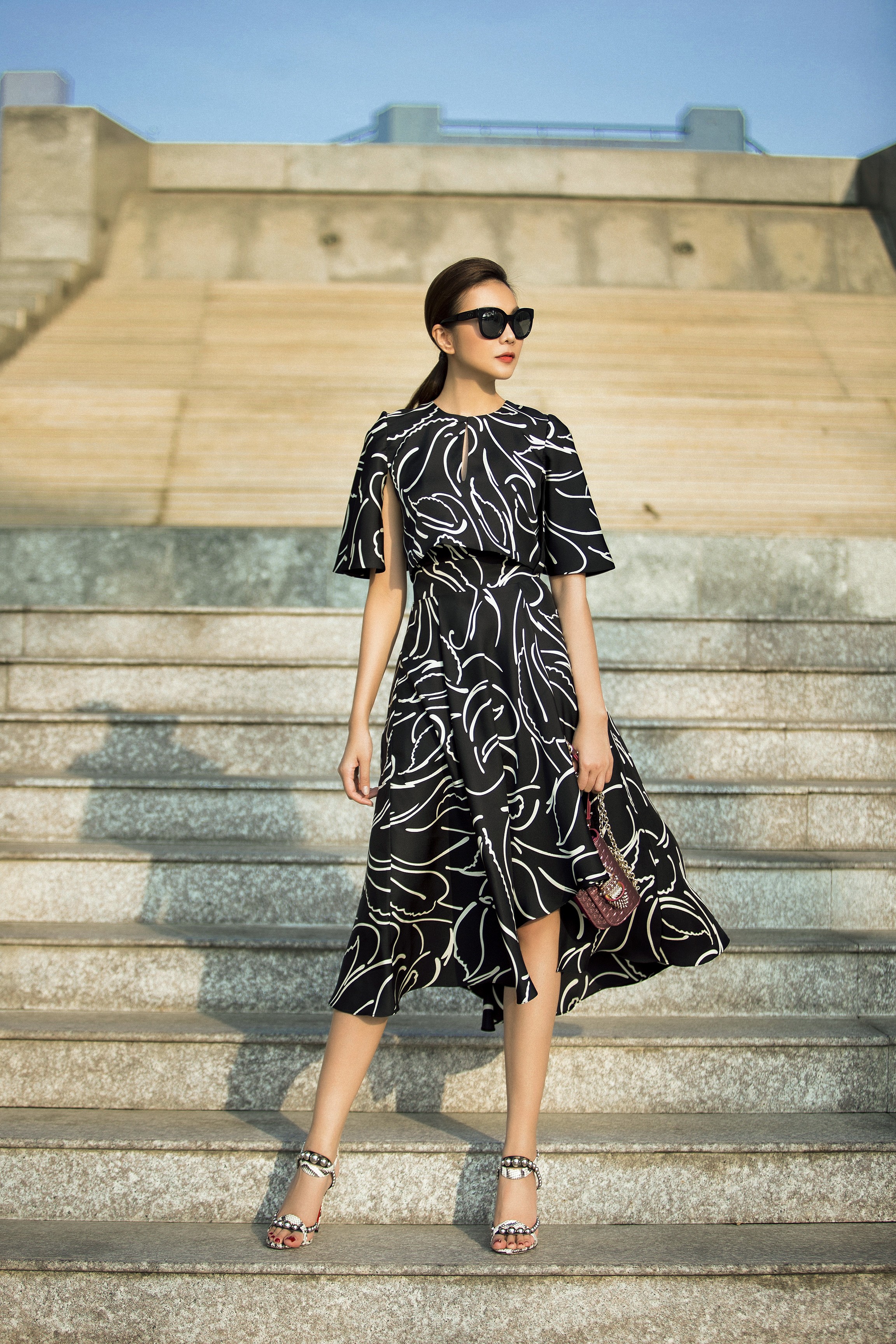 Một chiếc mắt kính đen có vẻ thô cứng nhưng lại tạo sự hòa huyện với chiếc váy. Nó xua tan nỗi lo “bánh bèo” mà các cô nàng hay lo lắng mỗi lần diện váy bồng.