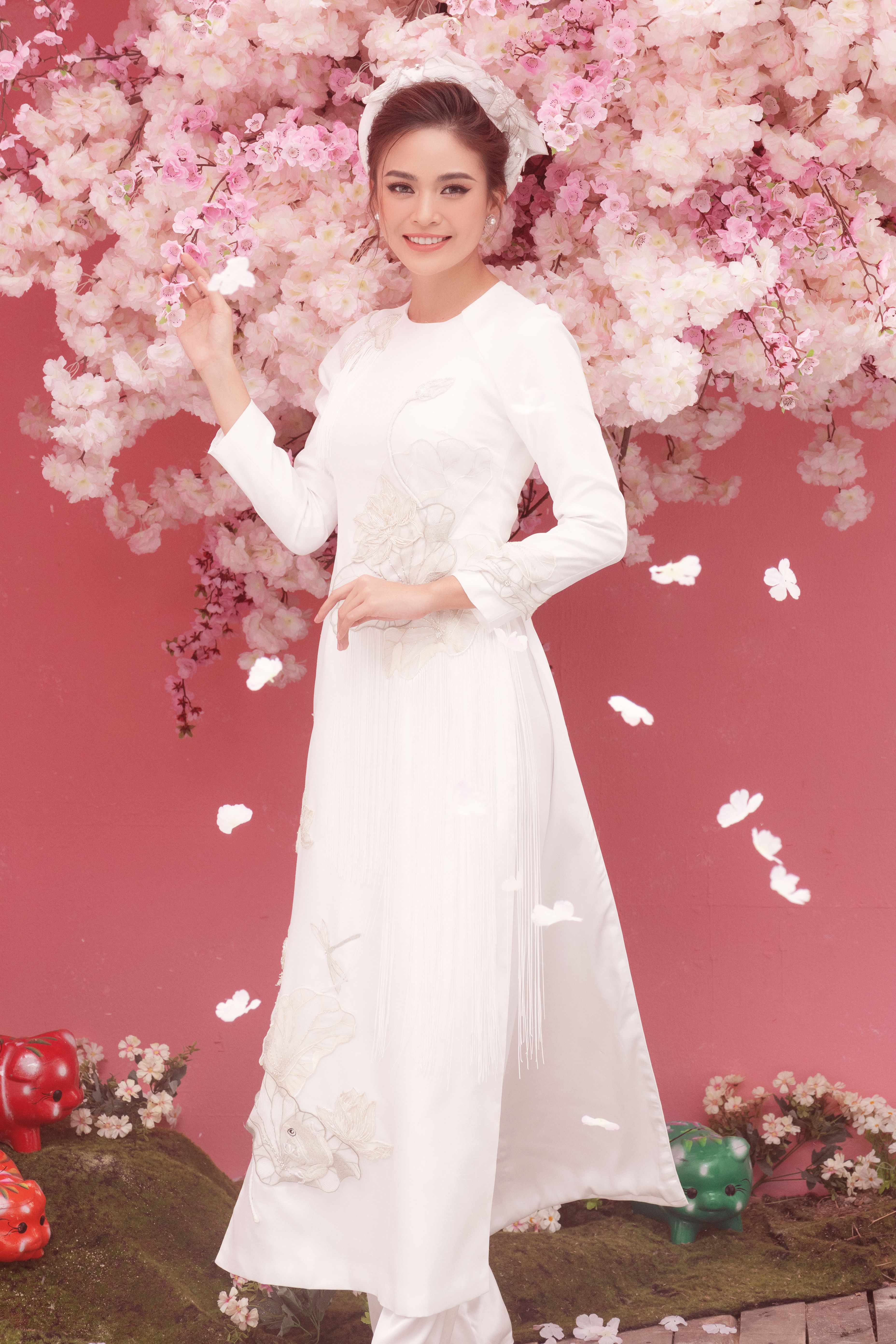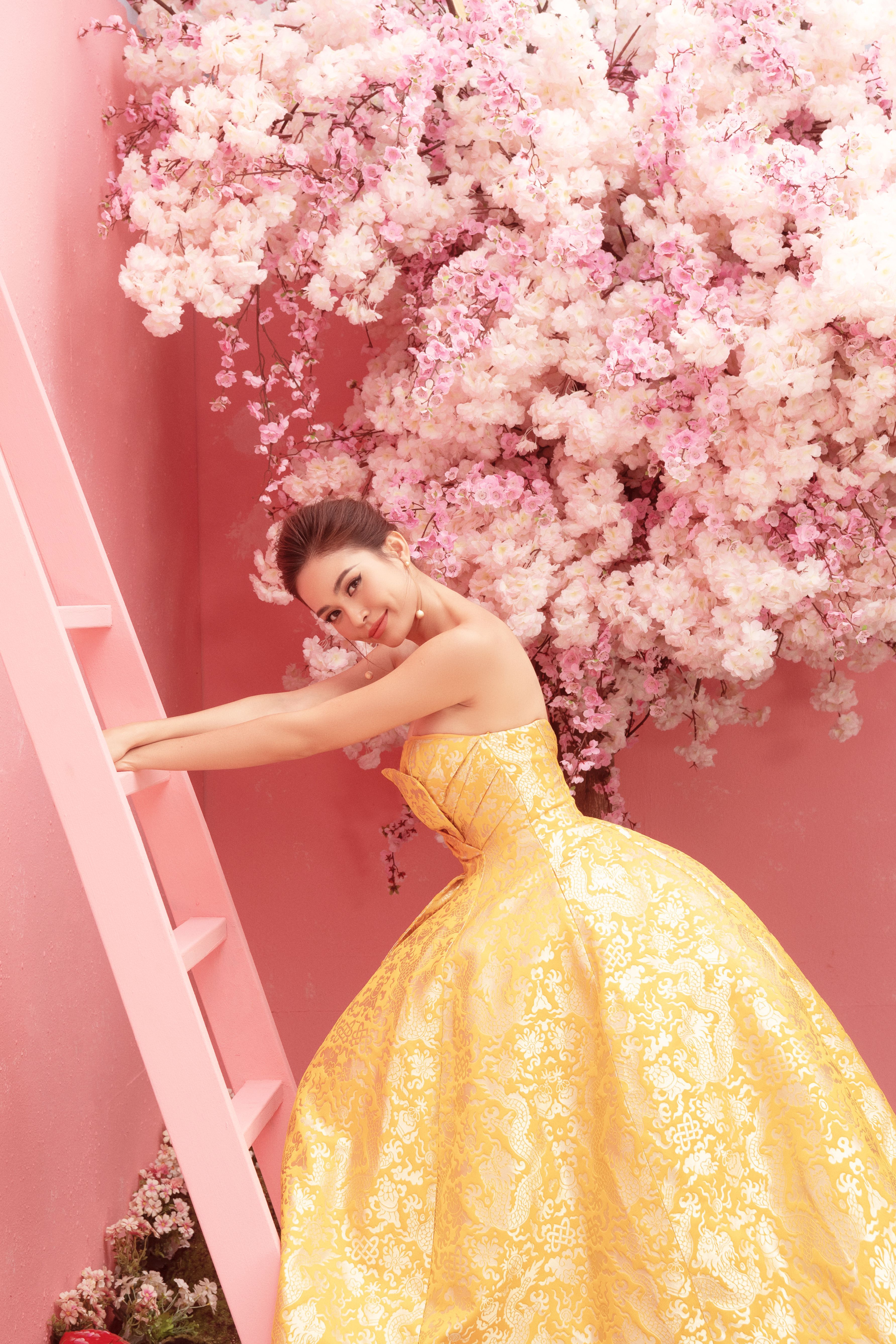 Nếu như năm ngoái, bộ ảnh có concept vui tươi, rộn rã những ngày đầu năm với tông màu đỏ đậm và những chú lân may mắn thì năm nay, ekip quyết định chọn chủ đề nhẹ nhàng, nữ tính với gam màu hồng và những tán hoa đào mềm mại, uyển chuyển. Bộ ảnh được chia thành 2 phần với những trang phục đến từ các nhà thiết kế nổi tiếng Việt Nam.