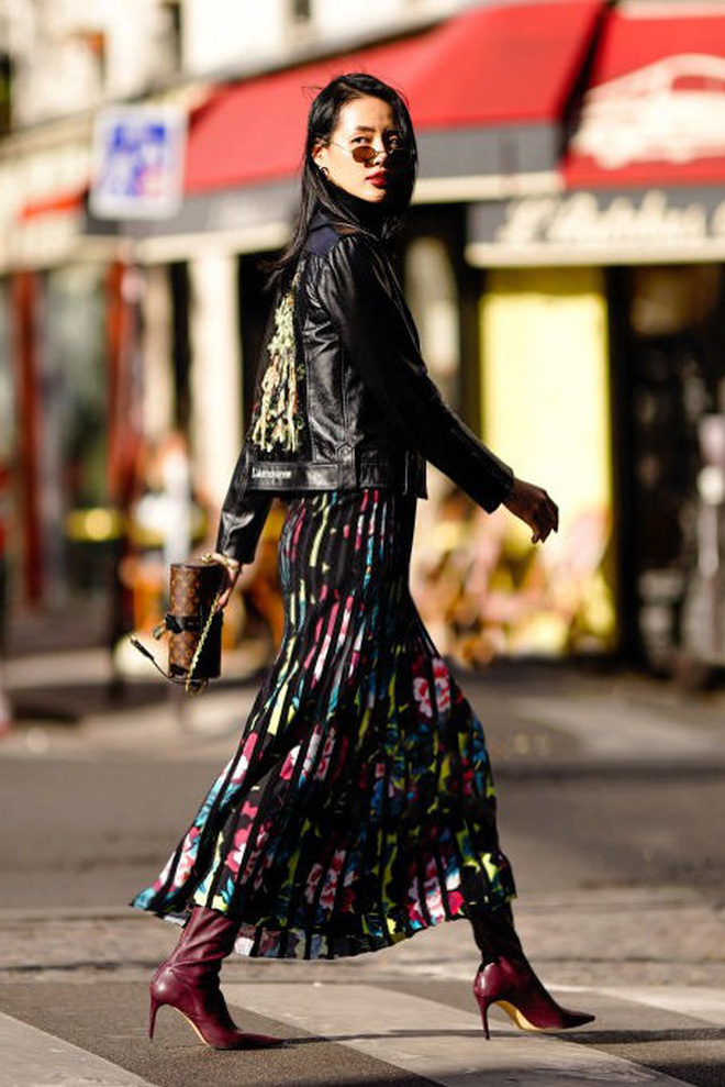 Áo khoác da thêu tay của NTK Trần Hùng được mix một cách khéo léo cùng chân váy dập pli họa tiết đem lại tổng thể ấn tượng.