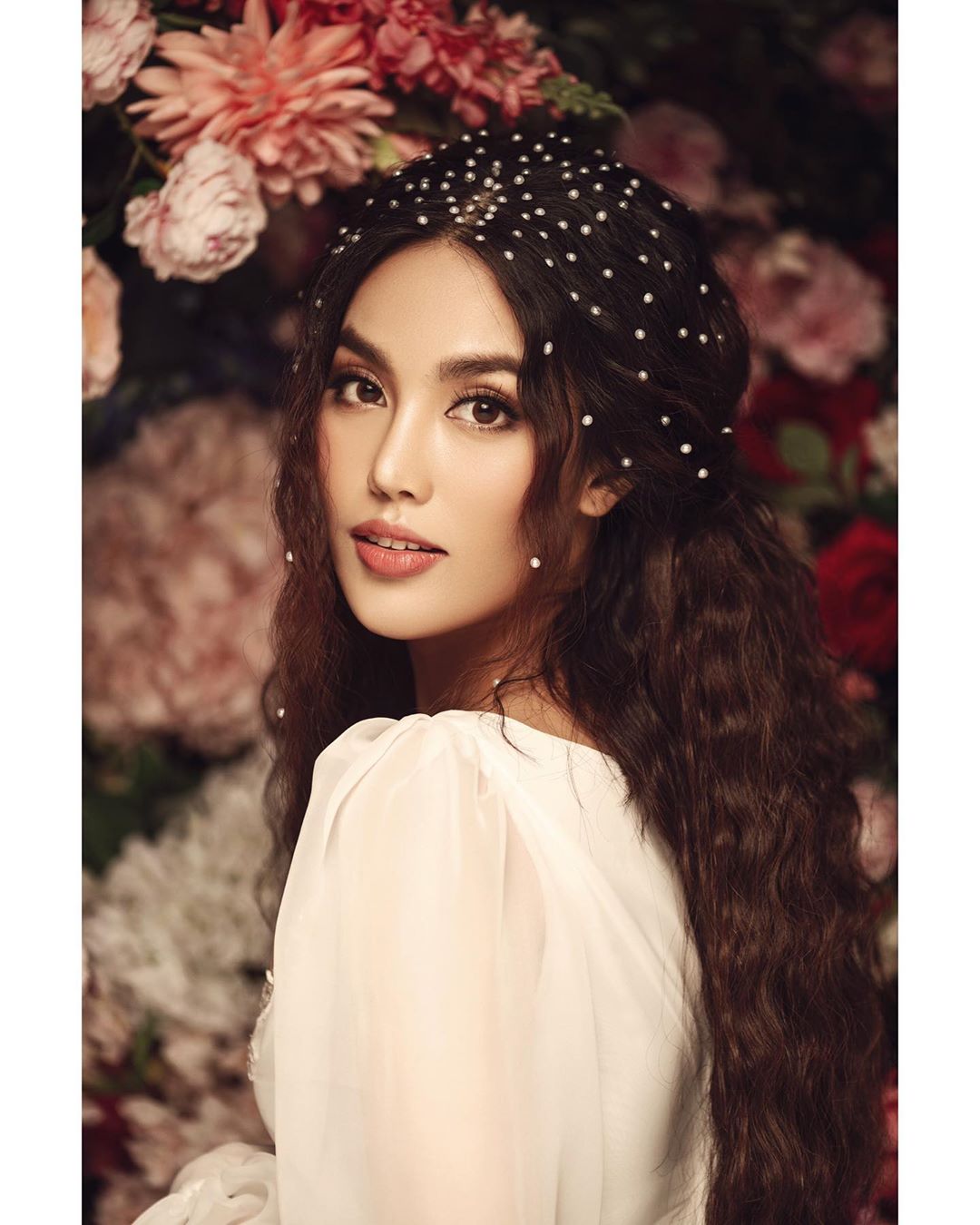 Mái tóc được bấm xù, đính kết ngọc trai. Người đẹp đùa tếu táo: “Mình định đính lên mặt nhưng dư quá nên cài cả lên tóc”.