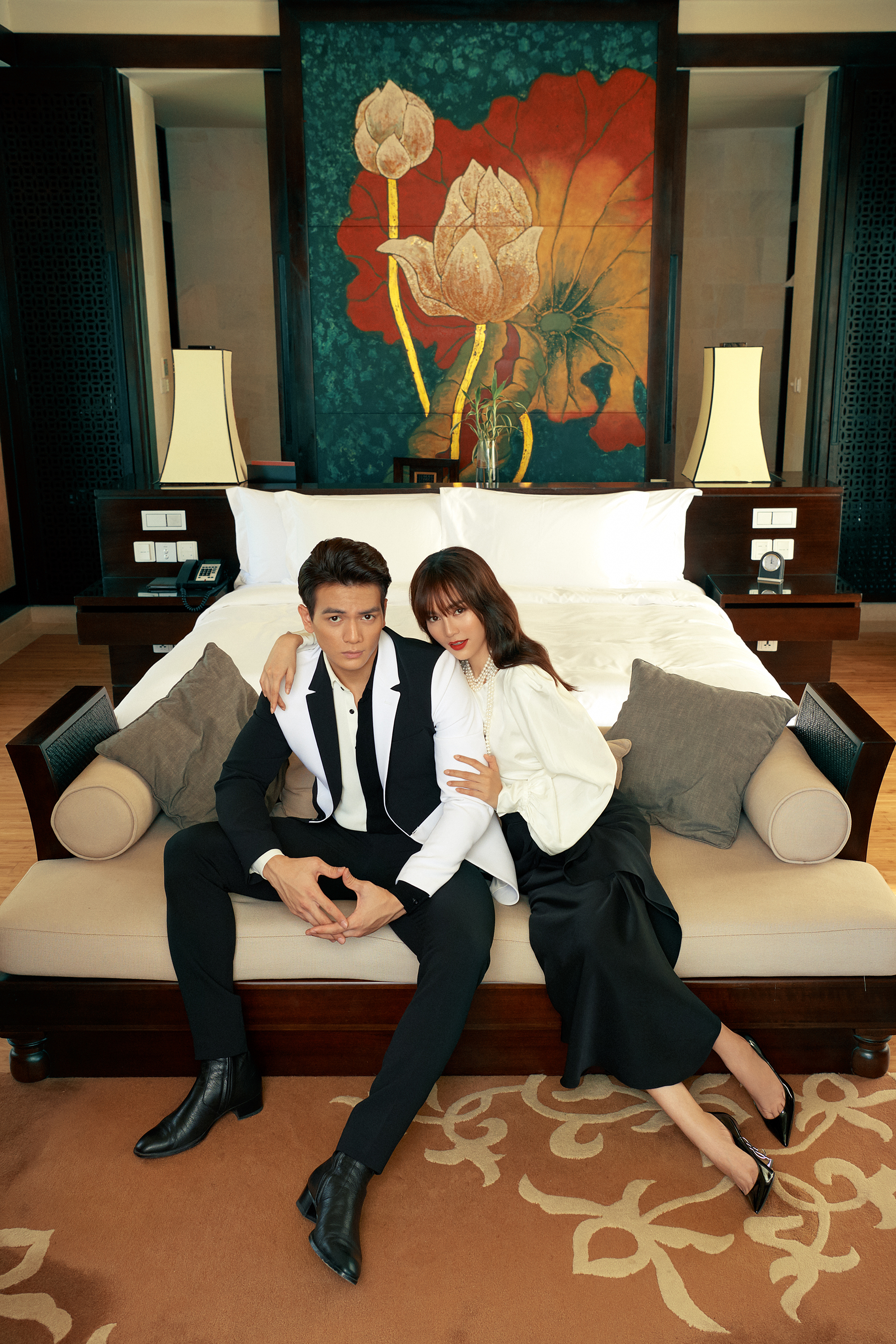 Hai gam màu trắng đen chưa bao giờ nhàm chán bởi sự biến tấu đa dạng. Thiết kế vest dành cho Lê Xuân Tiền được xử lý với những mảng màu cân đối, hài hoà, tương phản nhau qua trục. Trong khi đó, Lan Ngọc nền nã với sắc trắng có hoạ tiết nơ to bản.