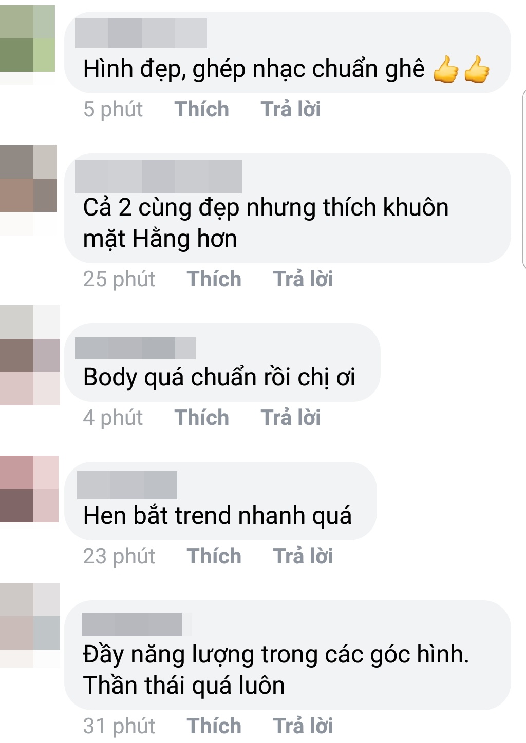 Phía dưới clip, không thiếu những bình luận trêu ghẹo bộ đôi “mẹ chồng, nàng dâu” - Hen, Hằng. Tuy nhiên, ai ai cũng dành muôn vàn lời khen cho thần thái chuẩn, nét sắc lạnh trong diễn xuất và hình thể “miễn chê” của hai nàng hậu.