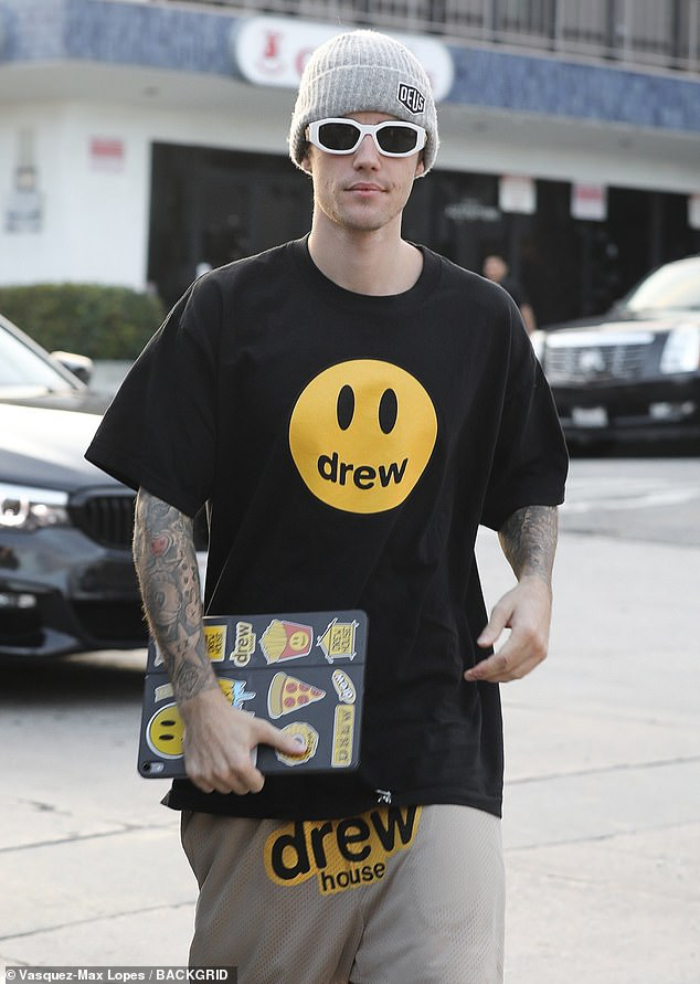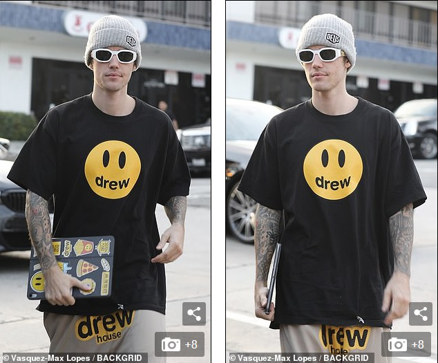 Justin Bieber thu hút tay săn ảnh khi xuất hiện trên phố khi mặc set đồ “Drew” cá tính của chính thương hiệu mình từ áo, quần cho đến ngay cả các hình dán chi chít trên máy tính bảng, khoe loạt hình xăm lớn ra phố một mình trước thềm đám cưới.
