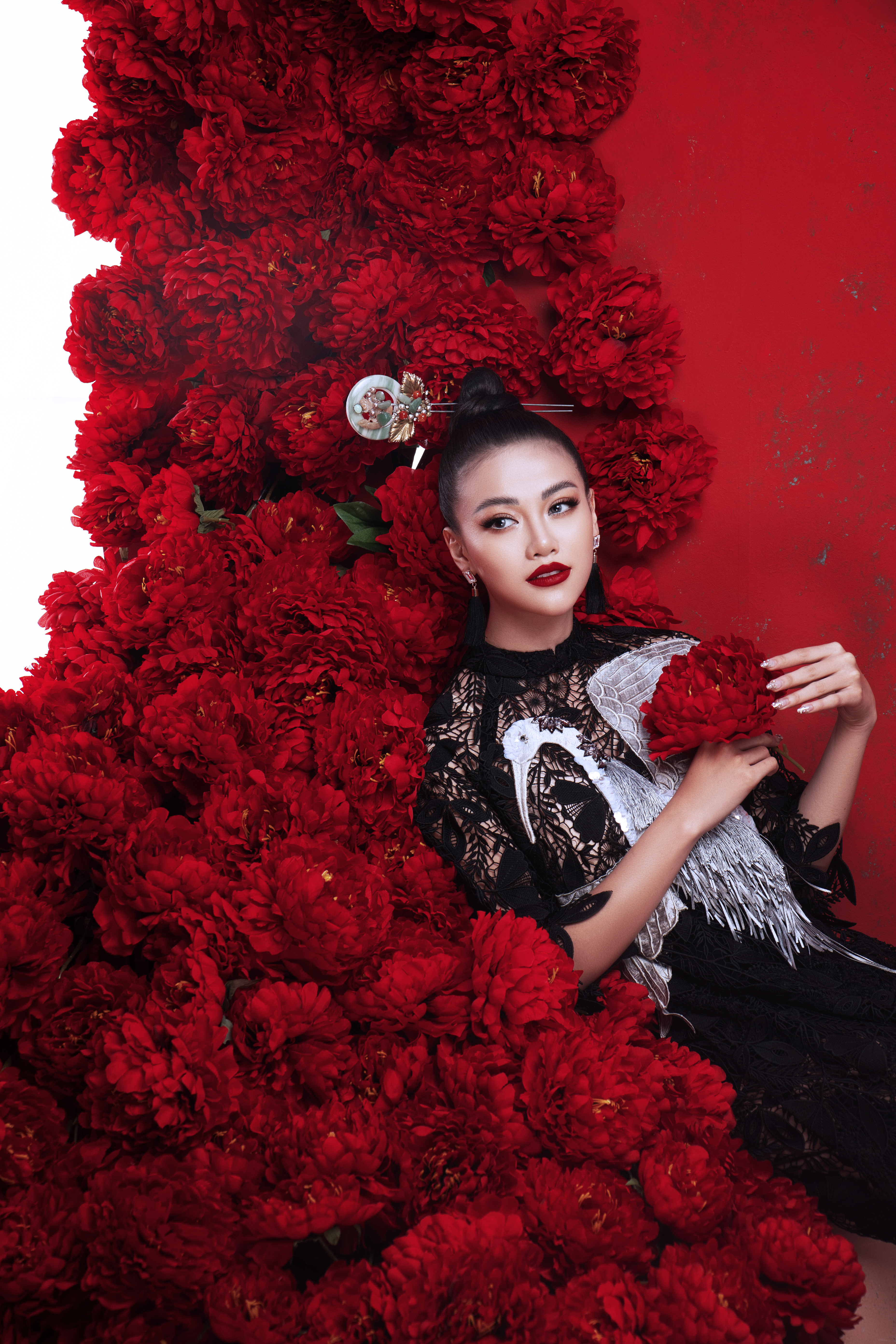 Bối cảnh được dàn dựng công phu với vô số đóa hoa đỏ rực càng tôn lên vẻ đẹp quyền lực, nổi bật của Phương Khánh.