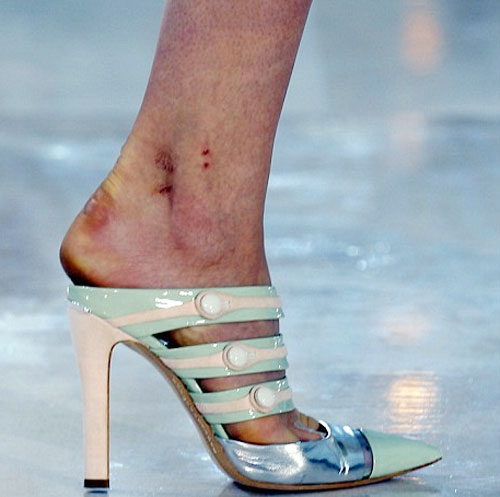 Càng hoạt động nghề người mẫu càng lâu, những vết thương từ việc mang giày cao gót càng lộ rõ, biểu hiện cụ thể là ở bàn chân. Những đôi giày cao gót khiến họ không chỉ bị đau nhức, trầy xước đôi chân mà còn ảnh hưởng đến hệ tuần hoàn lẫn hệ xương của người mẫu. Nhiều người mẫu đã mắc các bệnh về xương như lệch ngón chân, vẹo bàn chân.