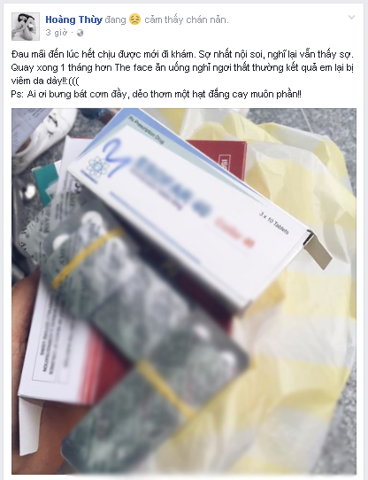Hoàng Thùy từng chia sẻ trên trang cá nhân rằng cô bị viêm dạ dày sau những ngày ăn uống thất thường khi quay hình một chương trình truyền hình thực tế.