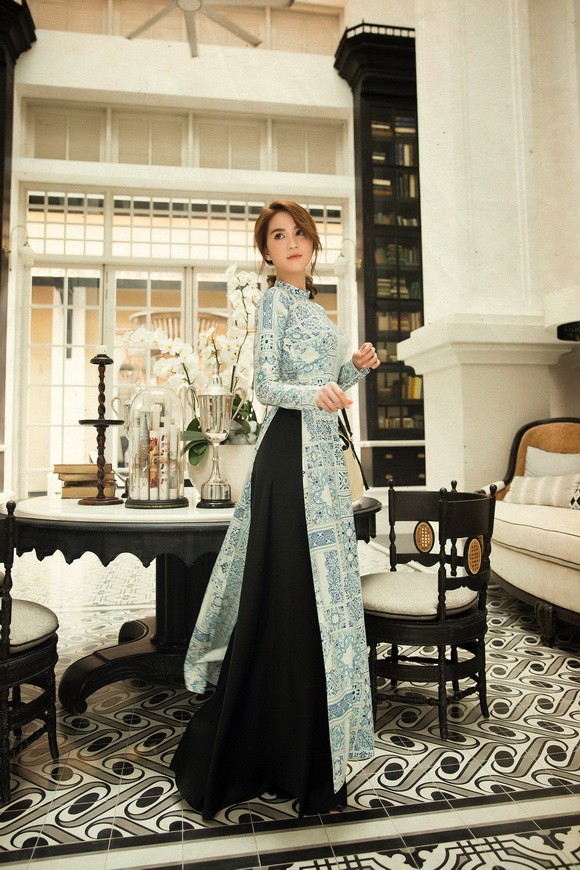 Vốn là một người mẫu chuyên nghiệp, Ngọc Trinh luôn biết cách tạo dáng thật tự nhiên khi diện áo dài.