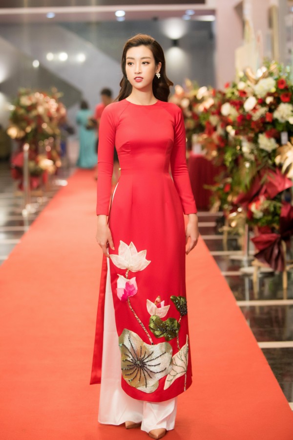Gam màu đỏ tươi tắn kết hợp cùng những họa tiết hoa lá được đính kết tay đã tạo ra một tổng thể đẹp mắt, hút trọn sự chú ý của khán giả.