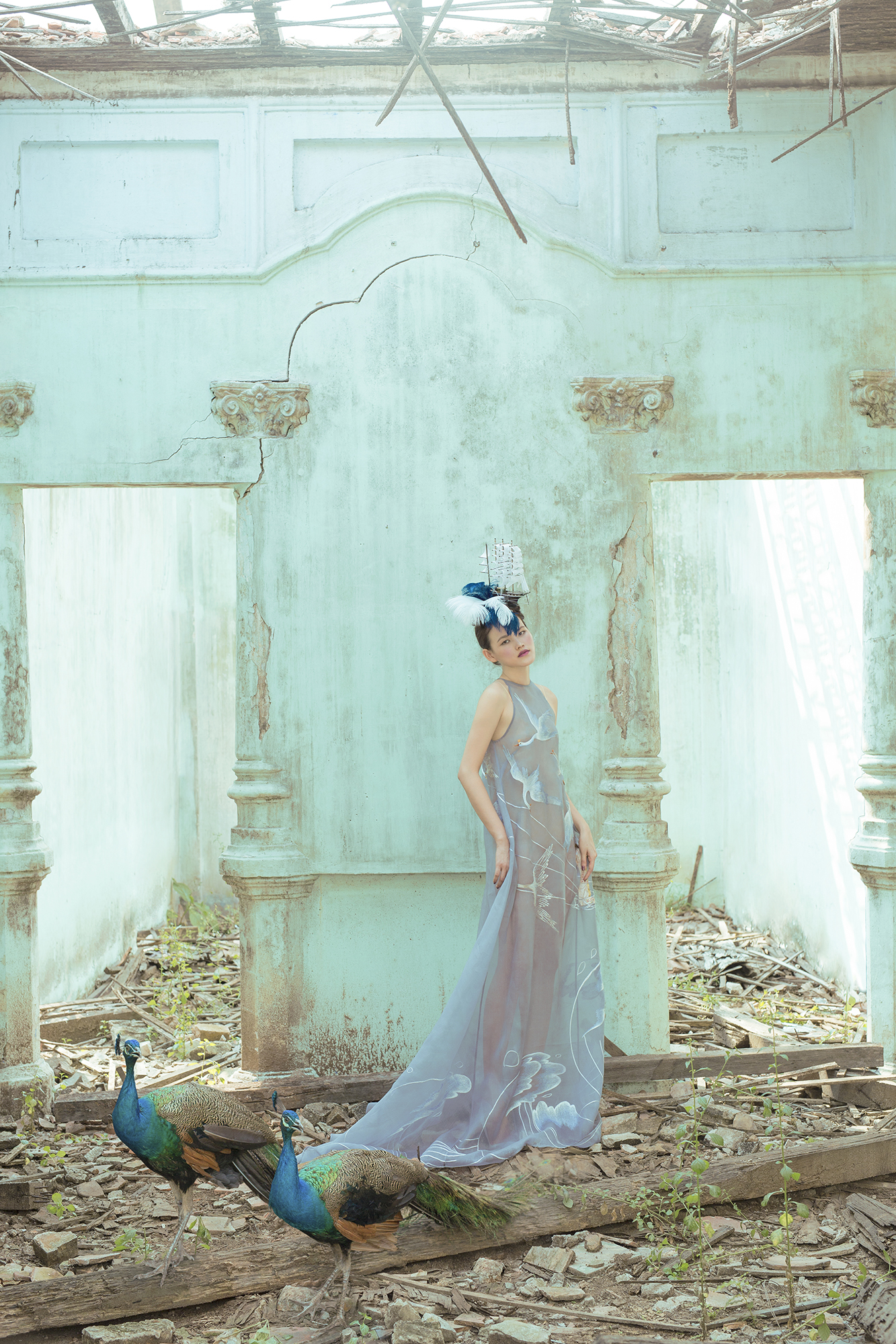 Với tông màu pastel trong trẻo và thơ của BST Children’s books của NTK Trần Hùng, Tuyết Lan đã mang đến cho người xem một câu chuyện bằng hình thể về một cô nàng cô chúa mơ màng lạc trong một lâu đài cổ với bạn diễn là chú chim công Ấn Độ.