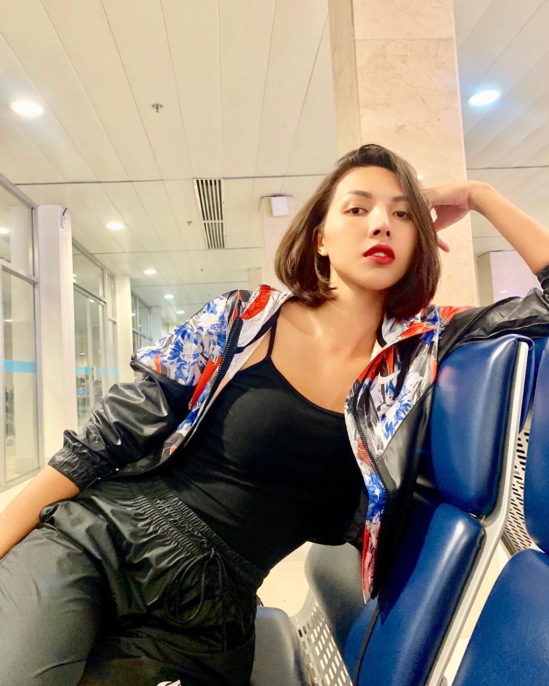 Ngọc Trinh tiếp tục khẳng định hình ảnh thời thượng khi thả dáng tại sân bay cùng cây đồ xu hướng gồm áo croptop, quần biker theo tông màu đen thời thượng.