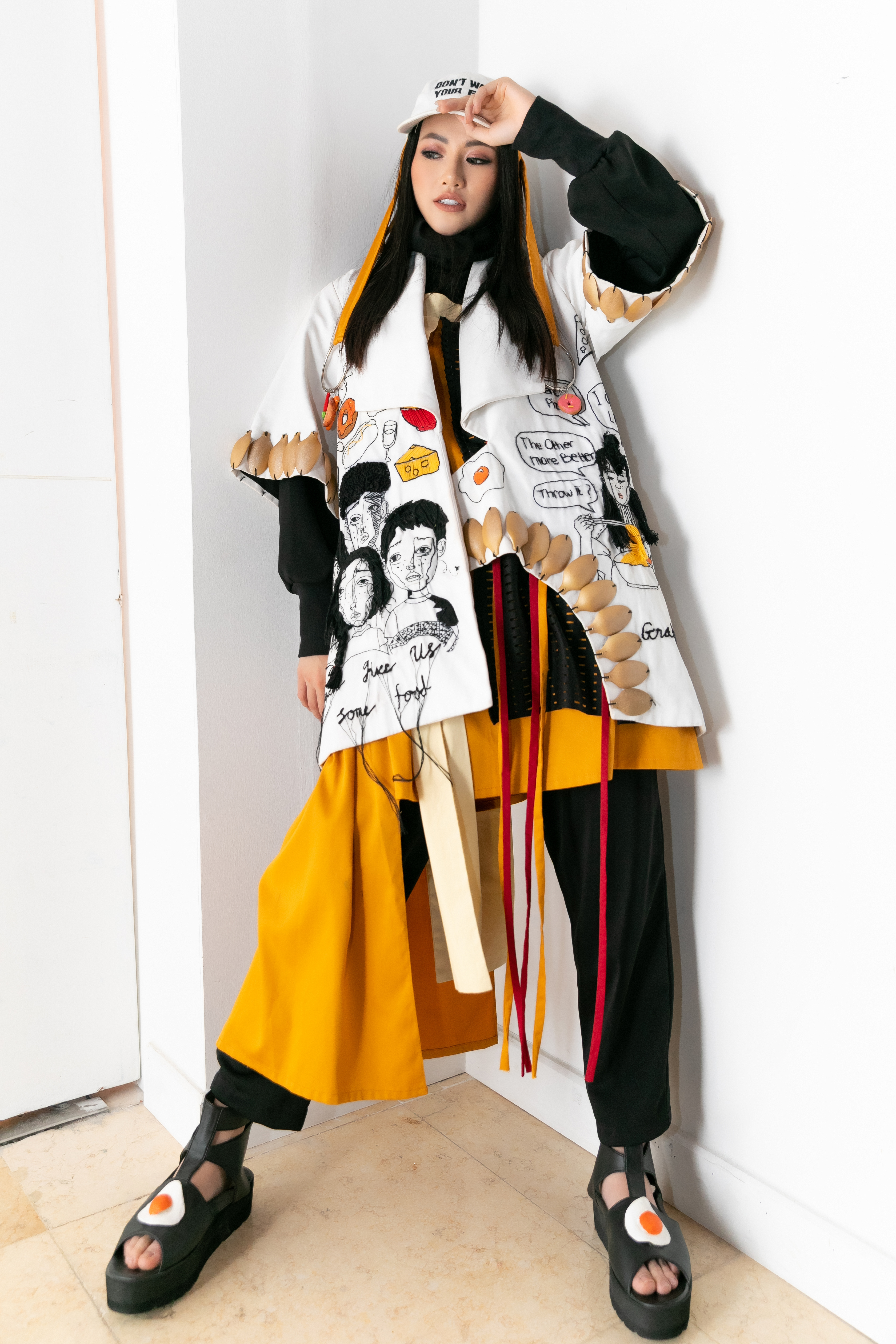 Nền chiếc áo mà Phương Khánh trình diễn khắc họa bức tranh đối lập về một cô bé thừa mứa và có ý ném bỏ thức ăn đối lập với nhiều trẻ em nghèo đói chỉ có mỗi khao khát được cơm no áo ấm.