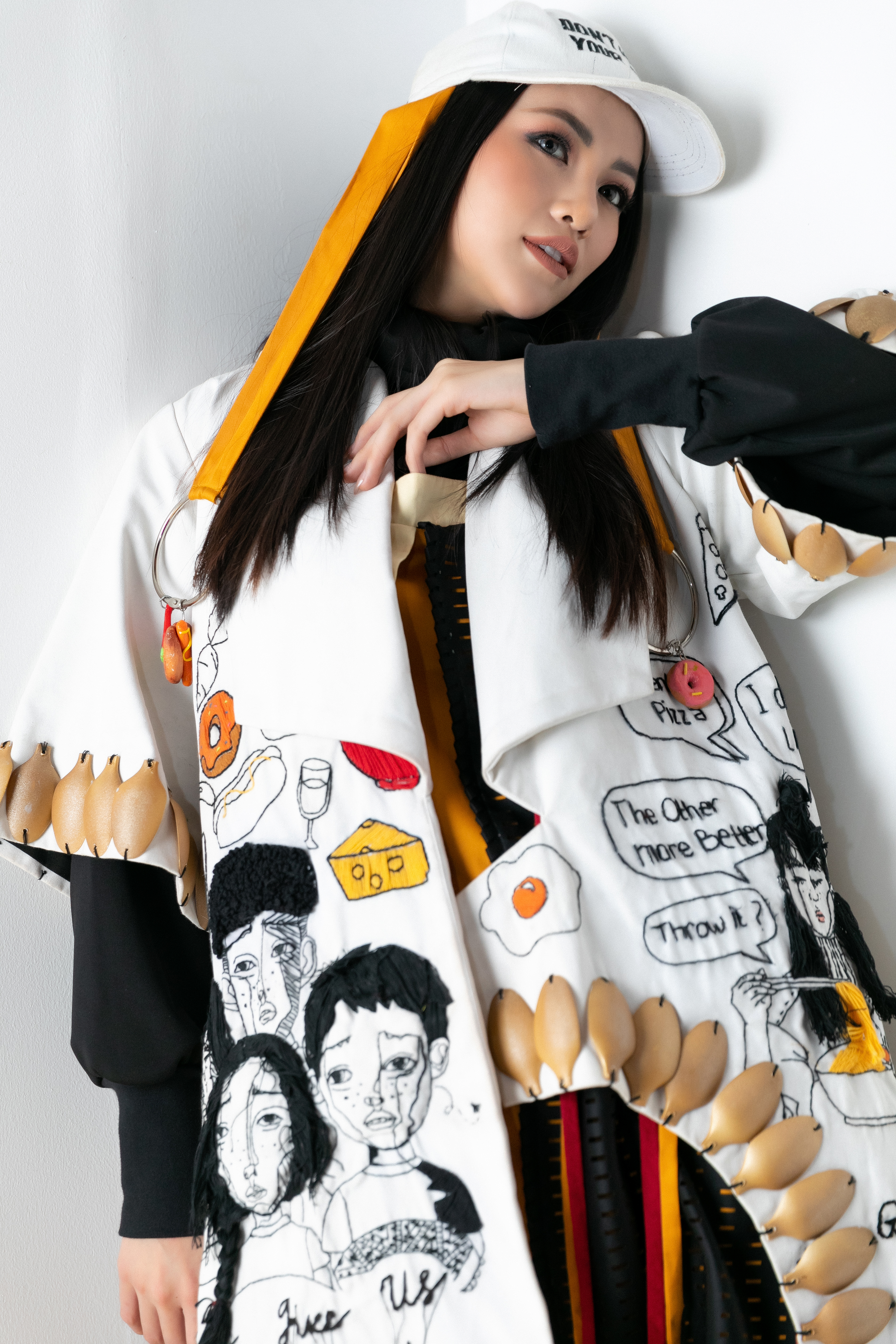 Thiết kế độc đáo nổi bật nhờ hàng thìa nhựa tái chế được đính kết ngộ nghĩnh cùng những họa tiết vẽ bánh ngọt, donut, bánh mì kẹp, mì ý tạo nên sự đối lập giữa thức ăn của trẻ em thành thị và những em bé có hoàn cảnh khó khăn.