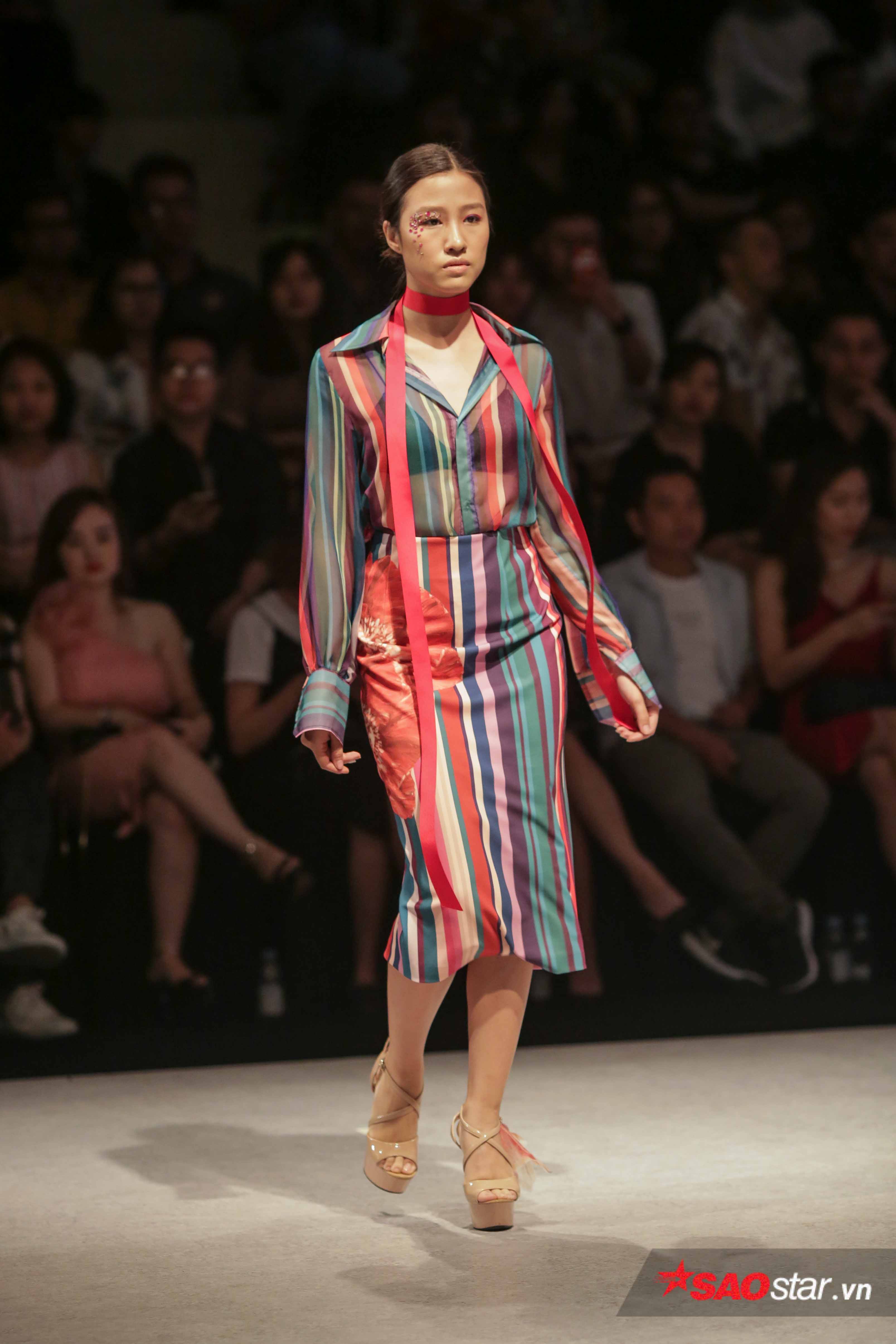 Sự pha trộn màu sắc được thể hiện hài hoà trên nhiều dáng váy với những đường kẻ viền kẻ màu. Mềm mại và uyển chuyển, những người mẫu bước đi trong thiết kế váy hai dây lưng trần ngày càng gợi cảm, góp phần phô diễn vẻ đẹp thanh xuân.