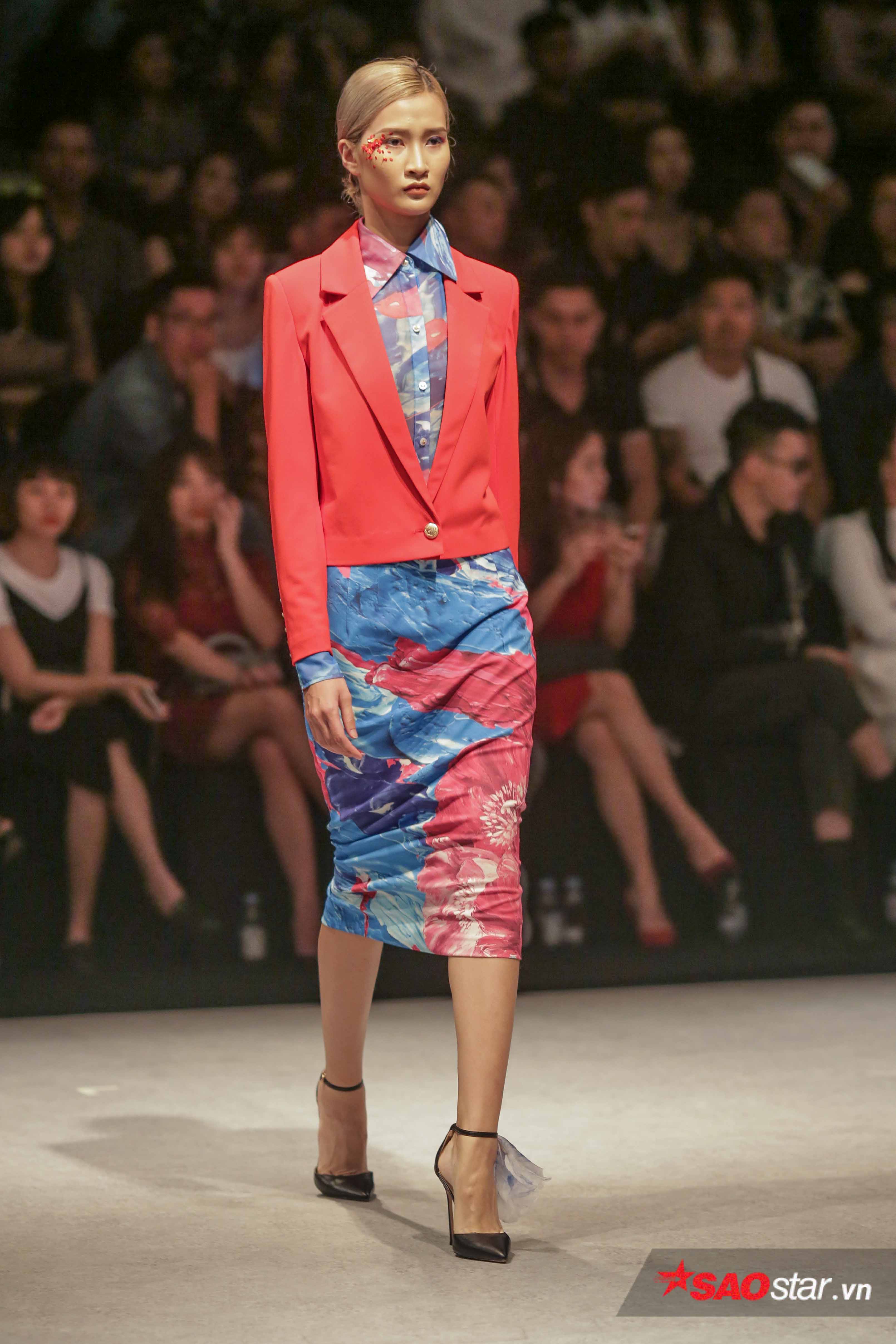 Lấy cảm hứng từ âu phục nam giới với quần đứng, quần tuxedo lụa, blazer và vest suông thanh lịch, gam chủ đạo BST là sắc màu đỏ và trắng quyền lực trên nền nghệ thuật cắt may tinh tế, phom dáng chắc chắn.