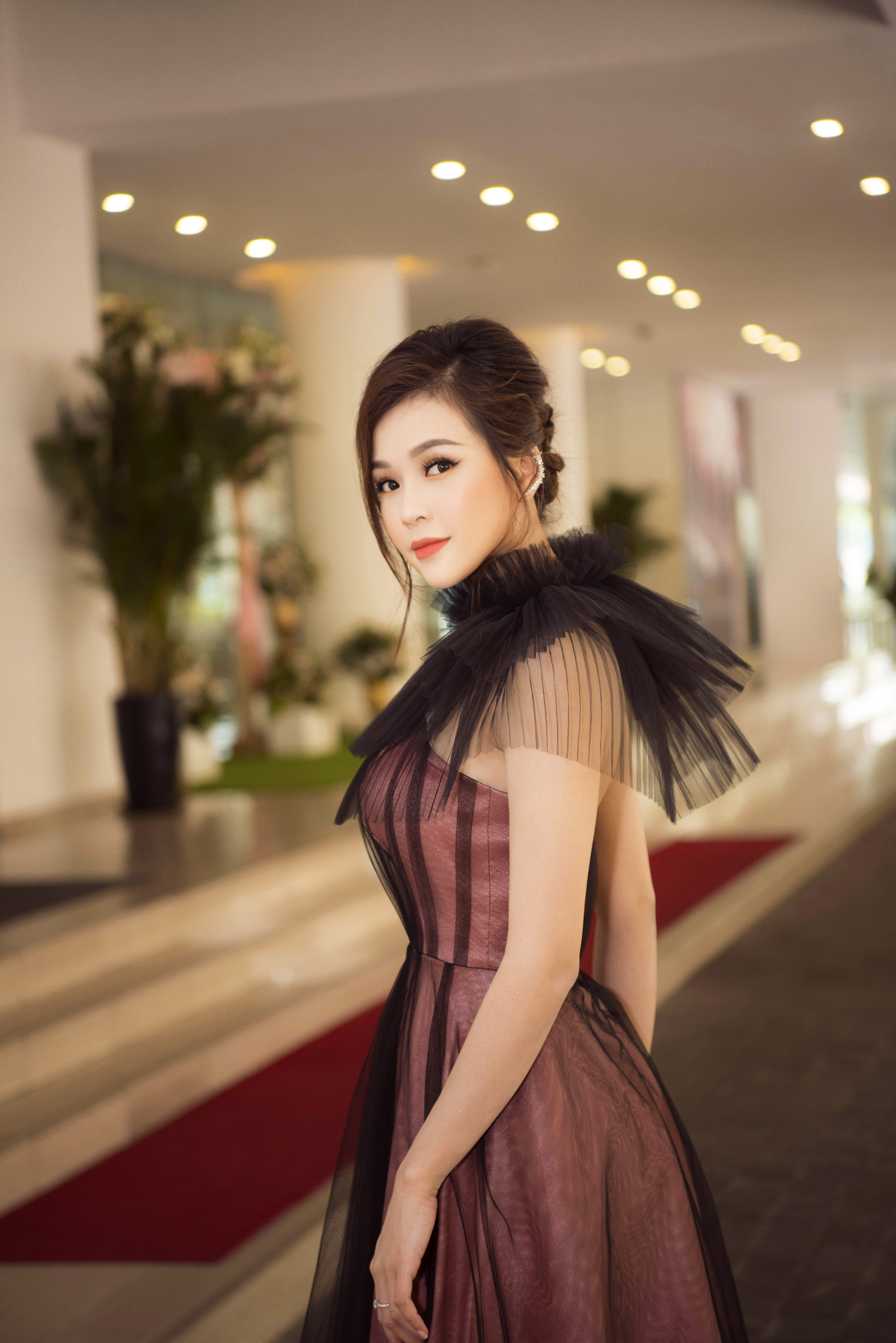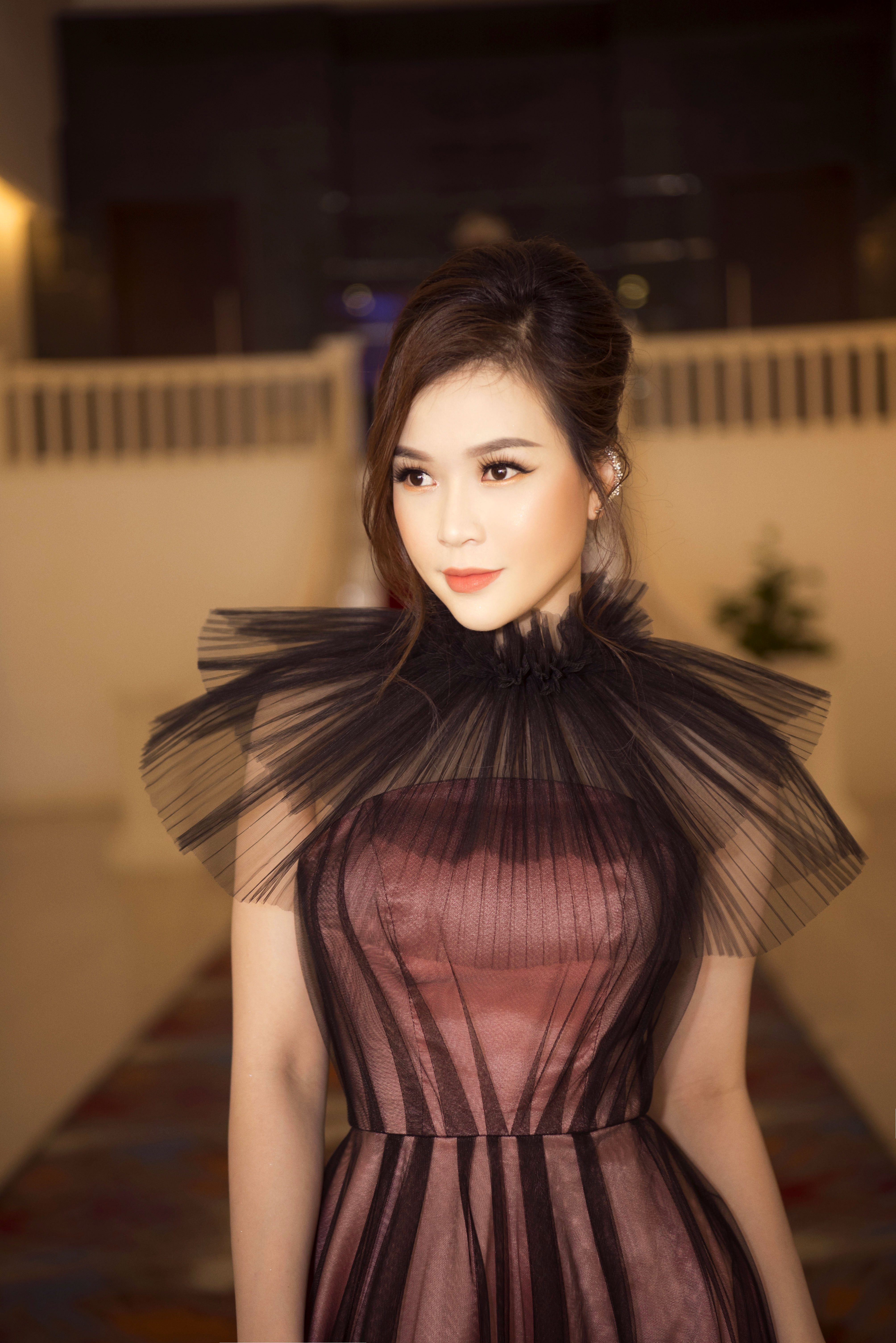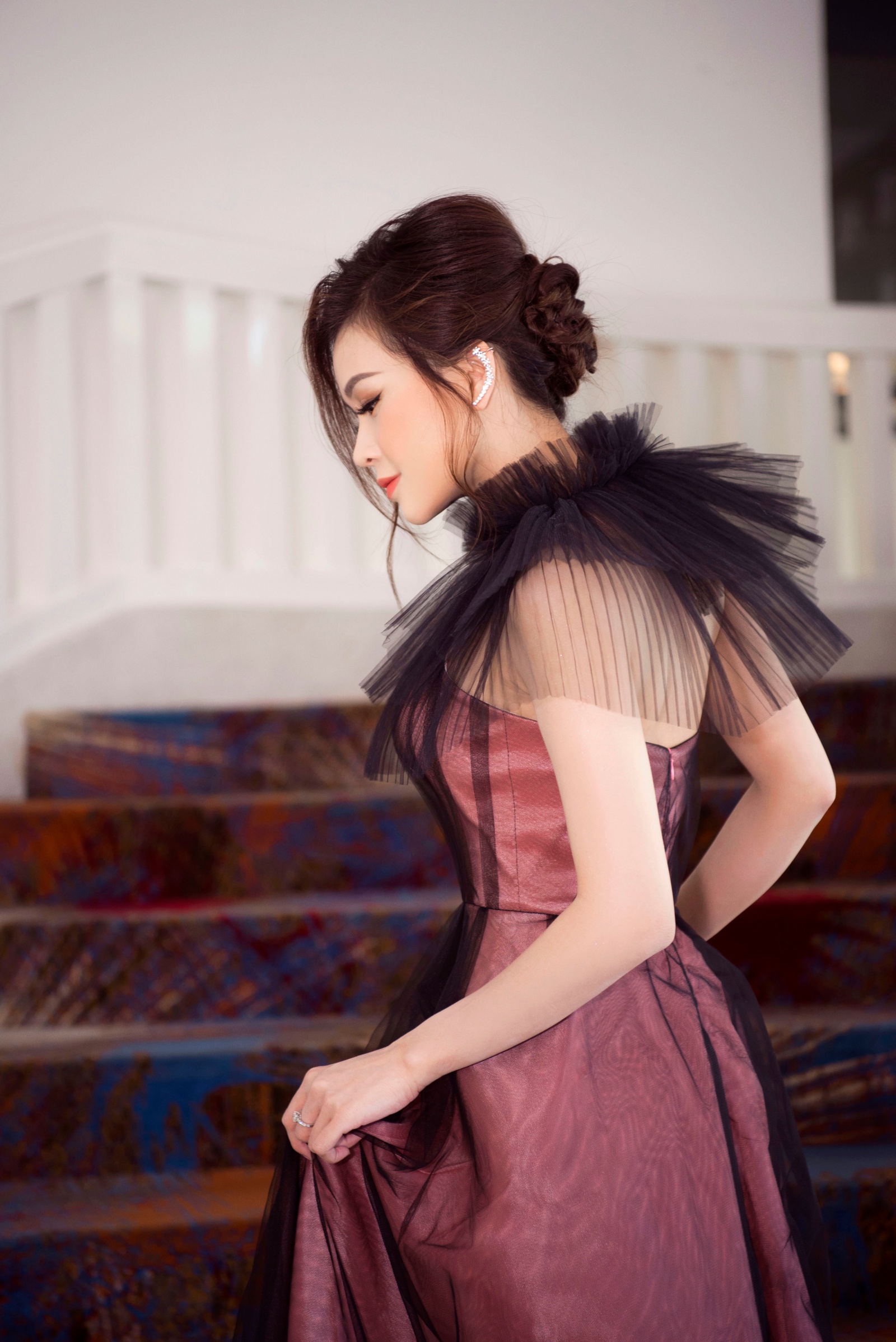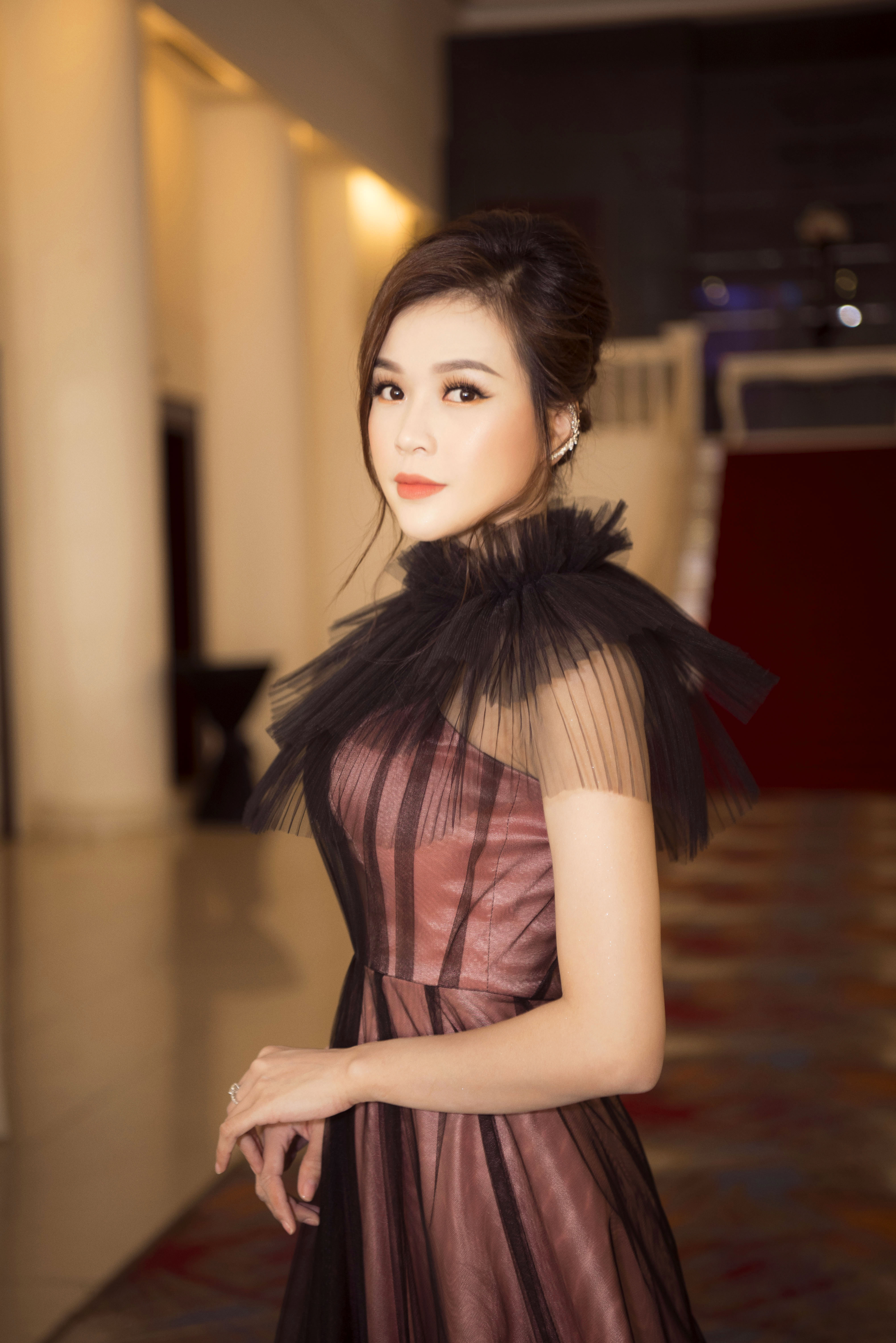 Mái tóc búi cao tôn lên làn da trắng sứ cùng chiếc cổ nhỏ, thanh mảnh.