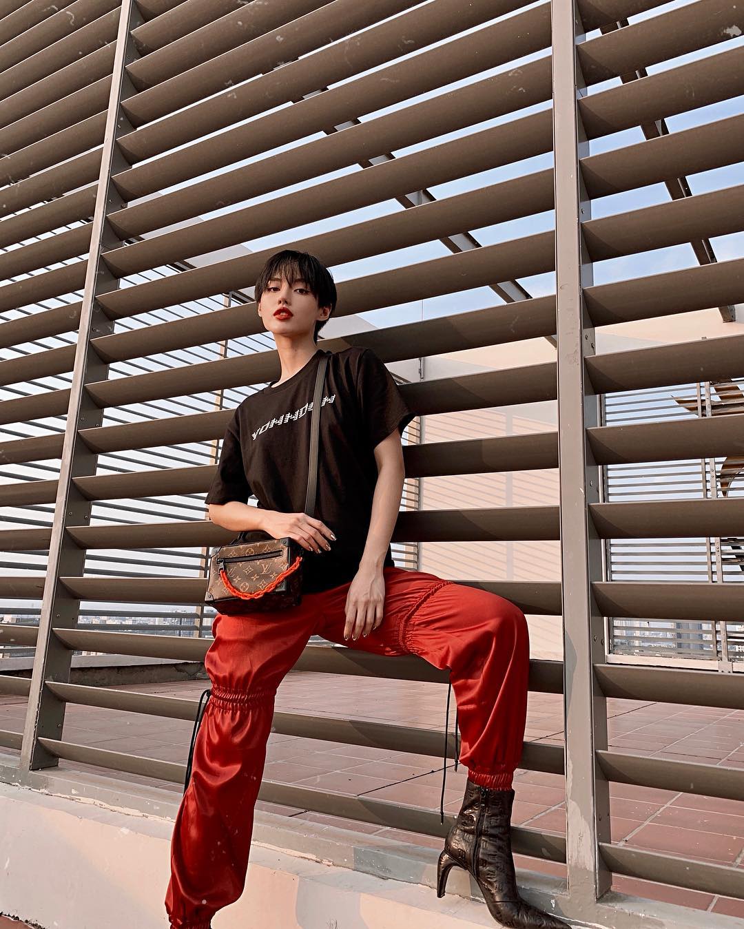 Khánh Linh The Face tiếp tục chứng tỏ gu ăn mặc thời thượng khi chỉ dùng đúng 2 tông màu đen đỏ mà đã tạo được set đồ cực chất.