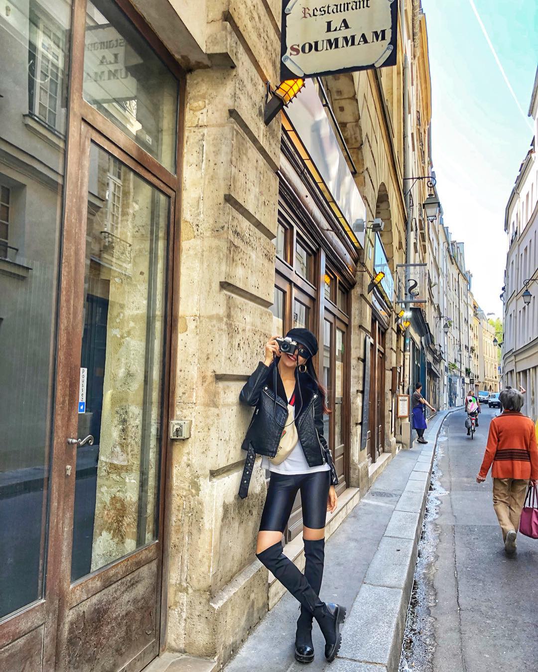 Quần xe đạp, áo khoác da và boots cổ cao là cách để Quỳnh Hoa trở nên nổi bật tại Paris.