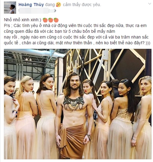 Theo như chia sẻ trên trang cá nhân của mình, Hoàng Thùy úp mở chuyện cô sẽ tham dự cuộc thi sắc đẹp với nội dung thông báo đến với người hâm mộ: “Nhỏ nhỏ xinh xinh. Các tình yêu ở nhà cứ động viên thi cuộc thi sắc đẹp nữa, thực ra em cũng quen đấu đá với các bạn từ 5 châu bốn bể mấy năm nay rồi , ngày nào em cũng có cuộc thi sắc đẹp với cả vài ba trăm nhan sắc quốc tế , chân ai cũng dài, mặt như thiên thần, nên ko biết thế nào đây!”