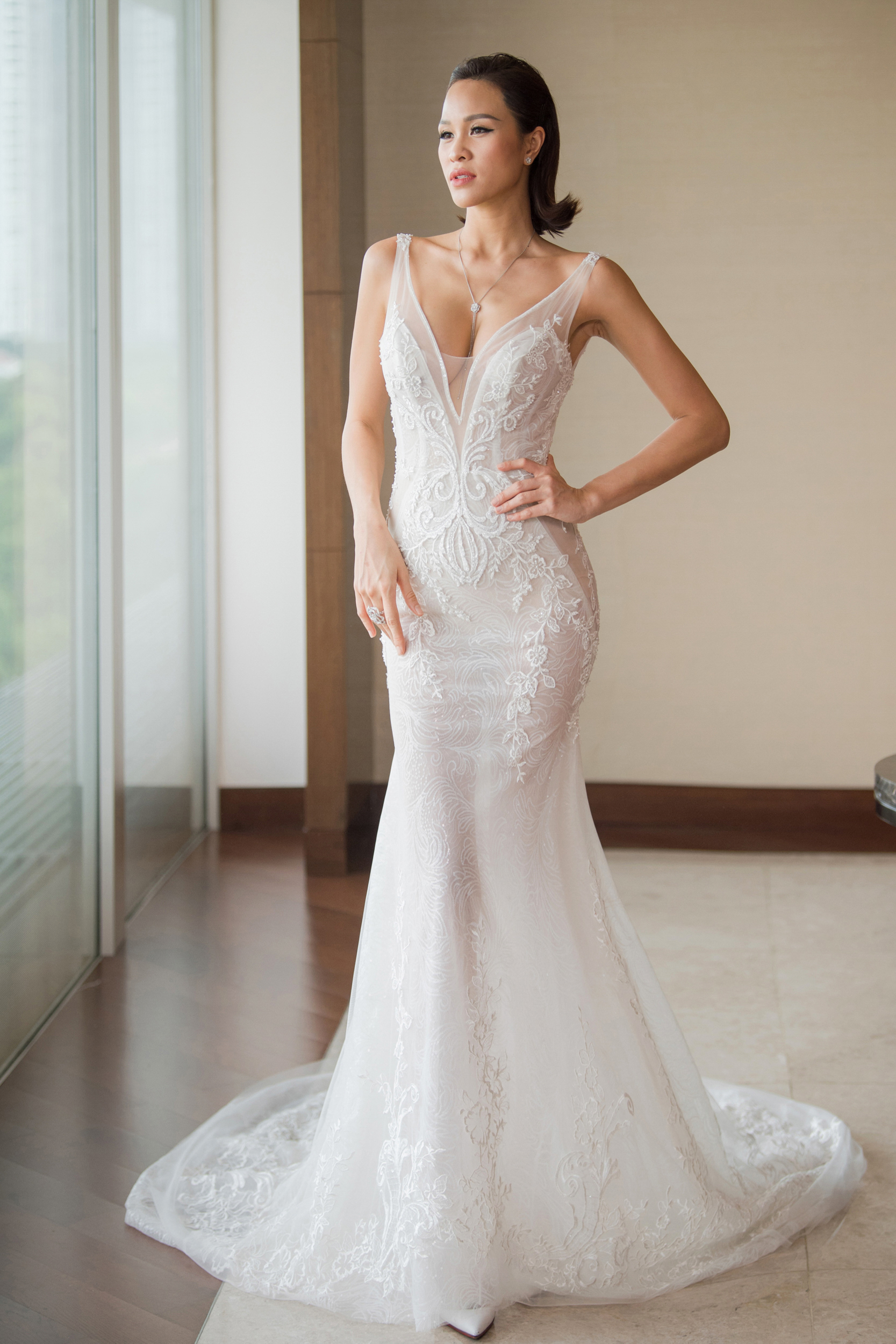 Đầu tiên phải kể đến chiếc váy đuôi cá có những khoảng phối vải xuyên thấu tuy hở nhưng không hề phô phang. Sáng tạo này có phần ngực xẻ sâu đồng thời đính kết những đóa hoa ren gợi cảm, thanh nhã.