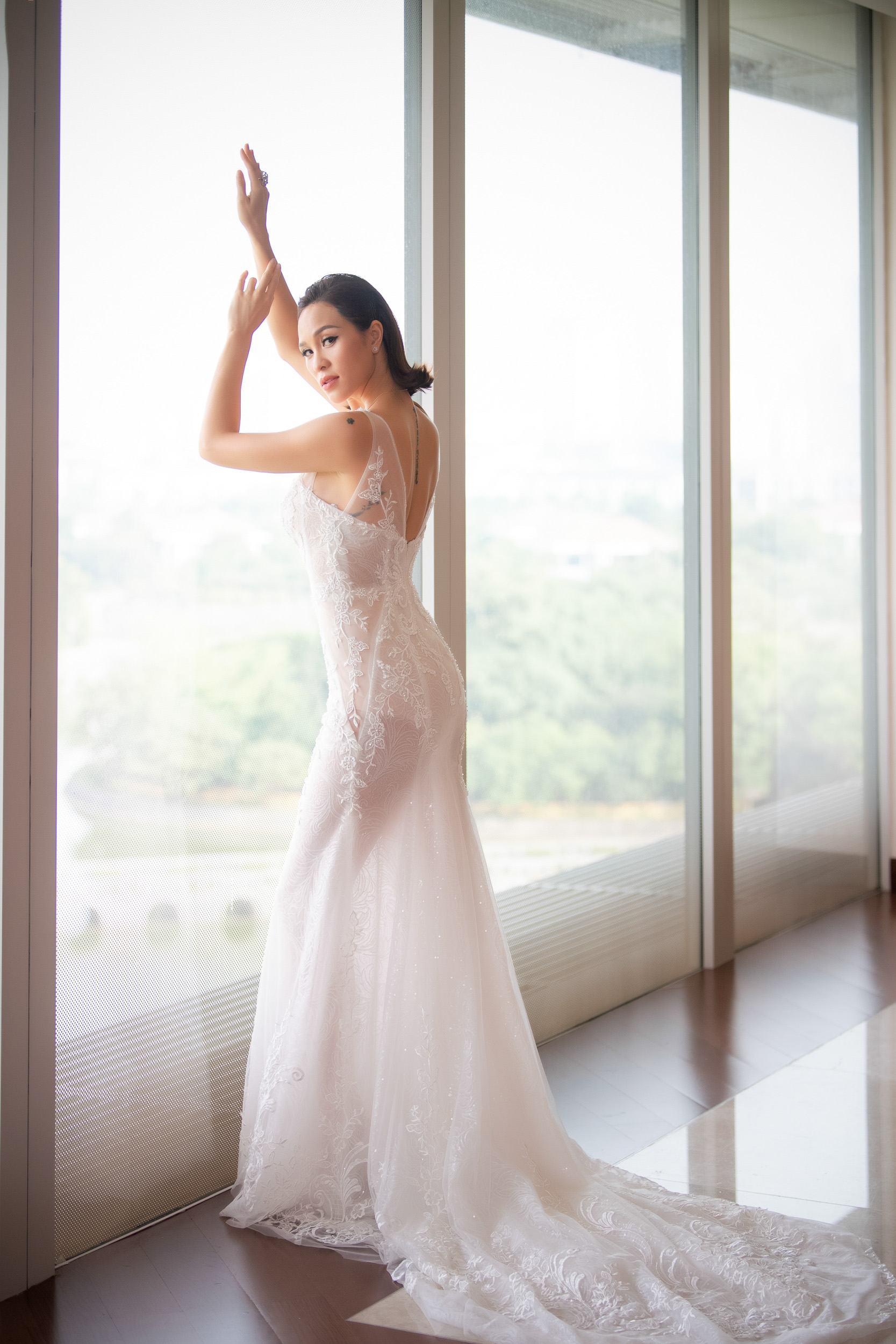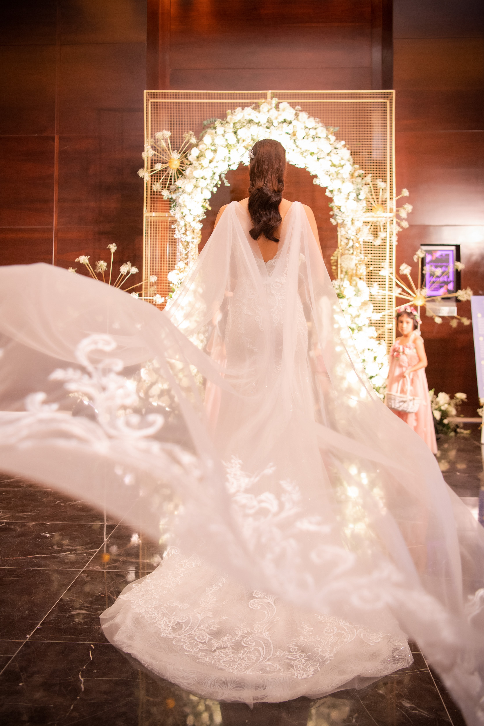 Đây cũng chính là bộ váy cô diện khi làm lễ, người đẹp chọn hoa cưới màu hồng tím thật nhạt để nổi bật trên nền trắng chất liệu.