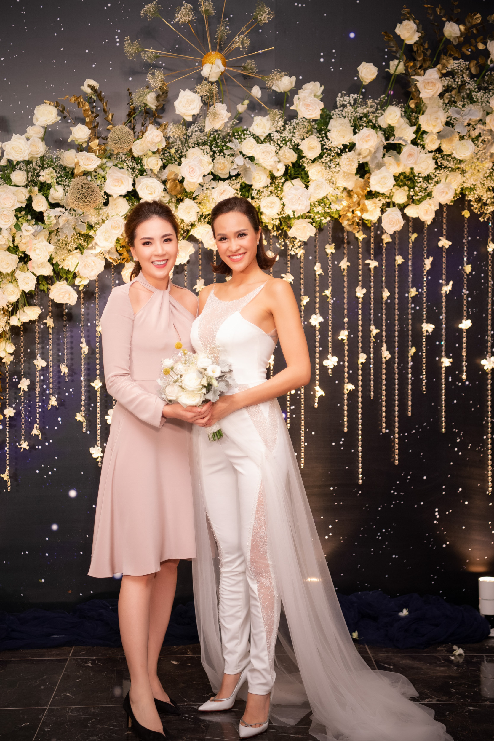 Khi đón tiếp bạn bè, Phương Mai diện áo cưới cách điệu như yếm cùng phần tà quét đất đi với quần âu ôm thanh lịch. Bộ cánh khá lạ mắt nhưng vẫn giữ được nét sang trọng của cô dâu trong ngày trọng đại.