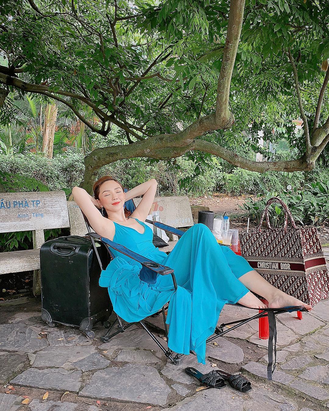 Cùng kiểu đầm hai dây trể nãi, nhưng Tóc Tiên lại lựa chọn chất liệu lụa mềm, tạo ra sự thoải mái, mềm mại rất phóng khoáng.