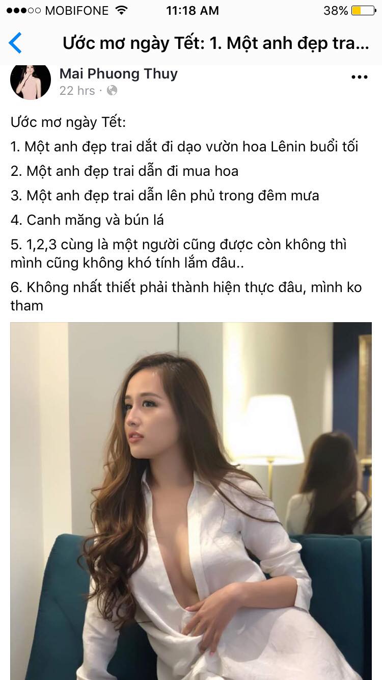 Dòng trạng thái của cô nàng ngay lập tức khiến fan thích thú, phải chăng vì muốn có trai đẹp mà thời gian gần đây, Mai Phương Thúy rất chăm ăn diện gợi cảm, không ít lần cô nàng đốt mắt khán giả vì những bộ cánh cùng lối tạo dáng vô cùng nóng bỏng.