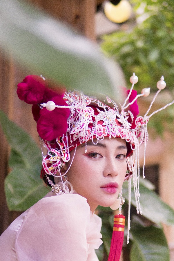 Cùng với đó là chiếc mũ hoa đội đầu, thường được sử dụng trong các đám cưới truyền thống Á Đông.