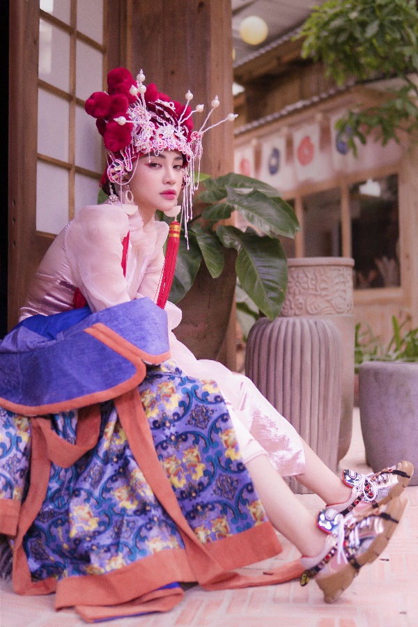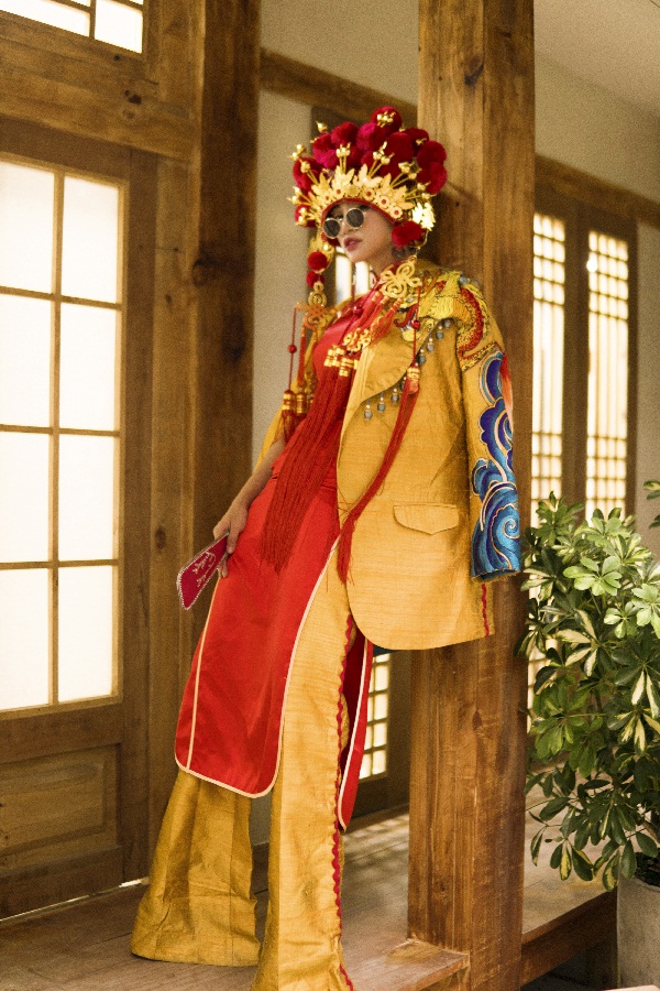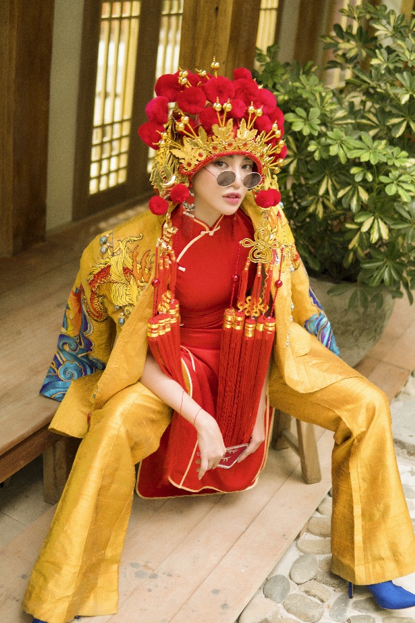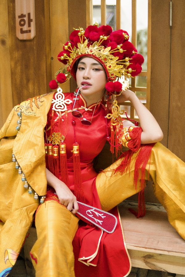 Trang phục gam màu vàng, đỏ mang đậm phong cách Á Đông được cô nàng khéo léo vận dụng trong bộ ảnh này.