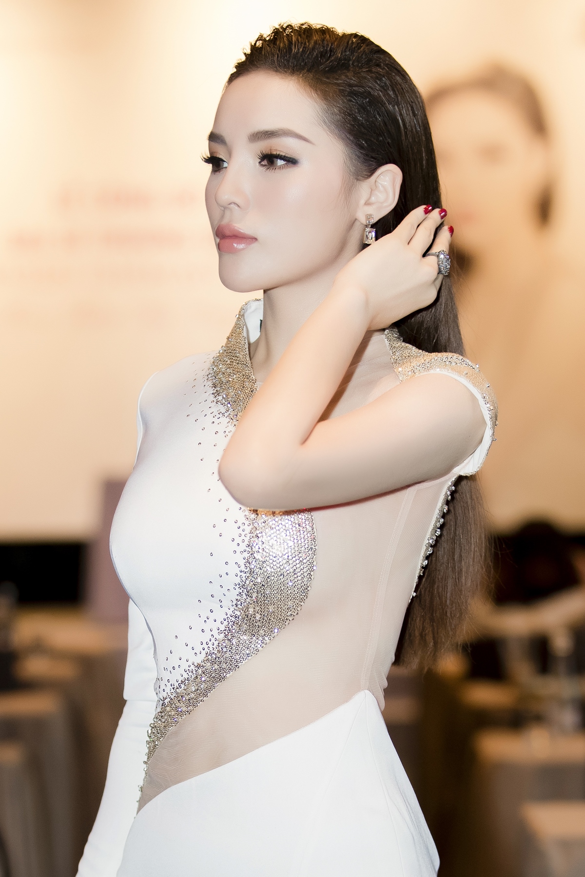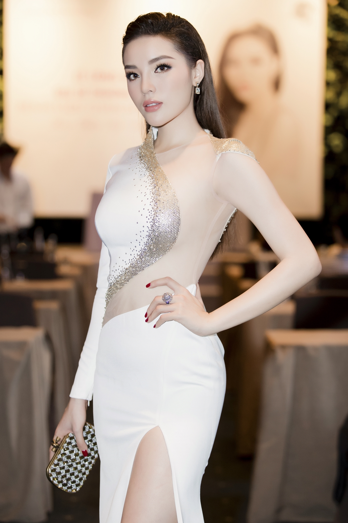 Tại sự kiện Kỳ Duyên còn gây chú ý khi mặc chiếc đầm vừa xuyên thấu lại vừa xẻ cao vun vút.