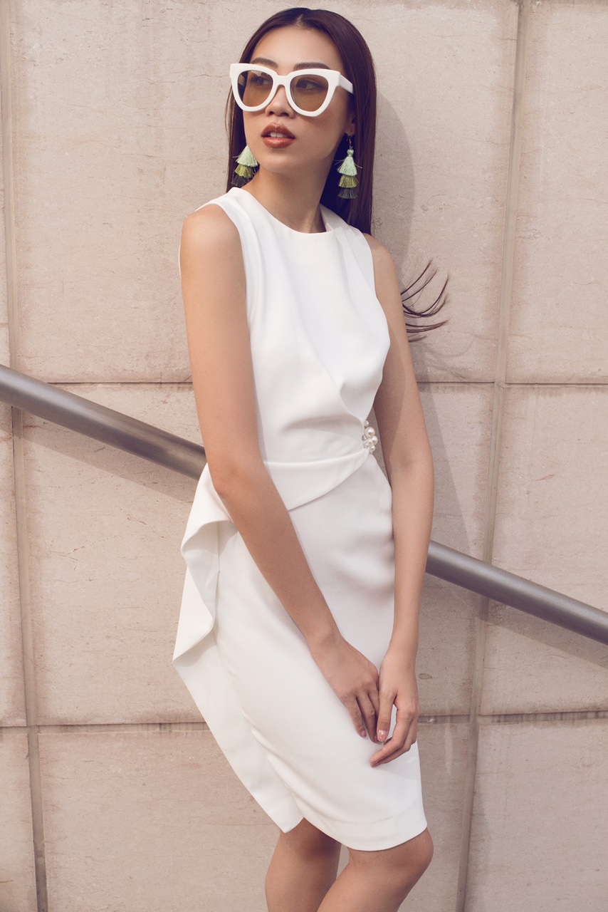 Chiếc đầm trắng với chi tiết bèo 3D là sự lựa chọn của Kikki Lê khi xuống phố cùng hai người em, cũng là hai người bạn thân thiết của mình.