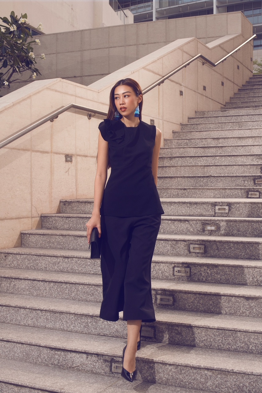 Cũng cùng tông đen, nhưng bộ cánh này của Kikki Lê đánh vào việc lựa chọn hoa tai màu nổi làm điểm nhấn.
