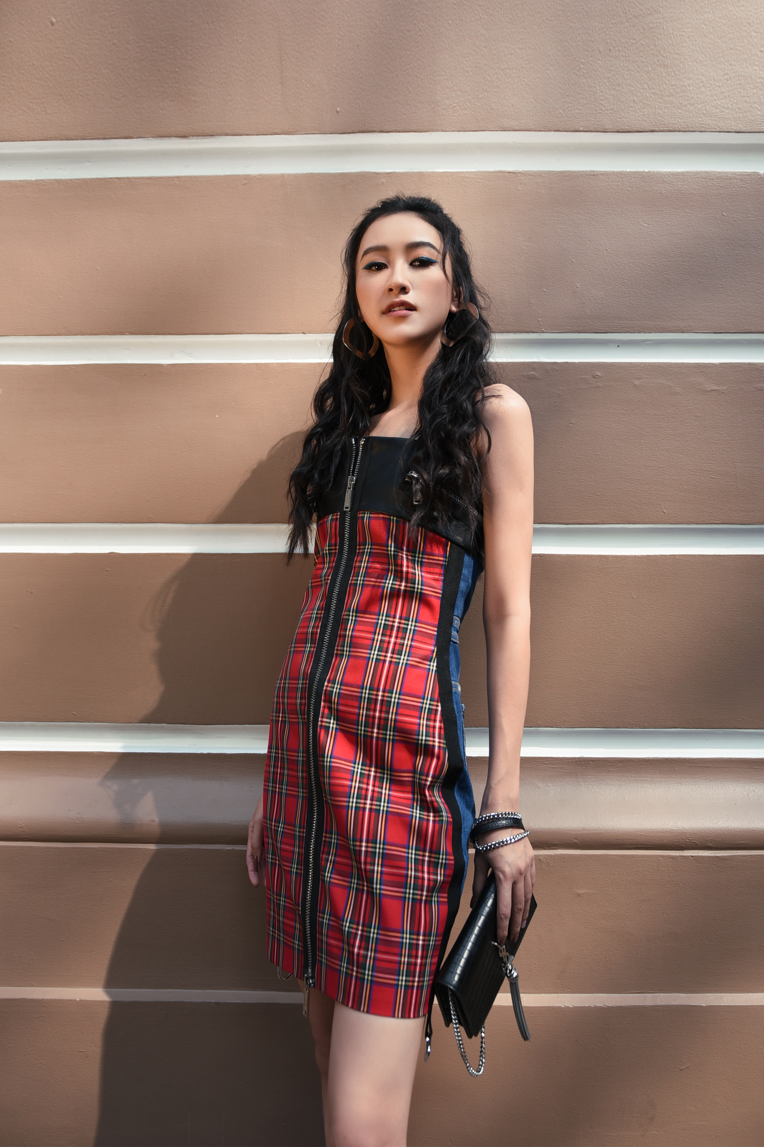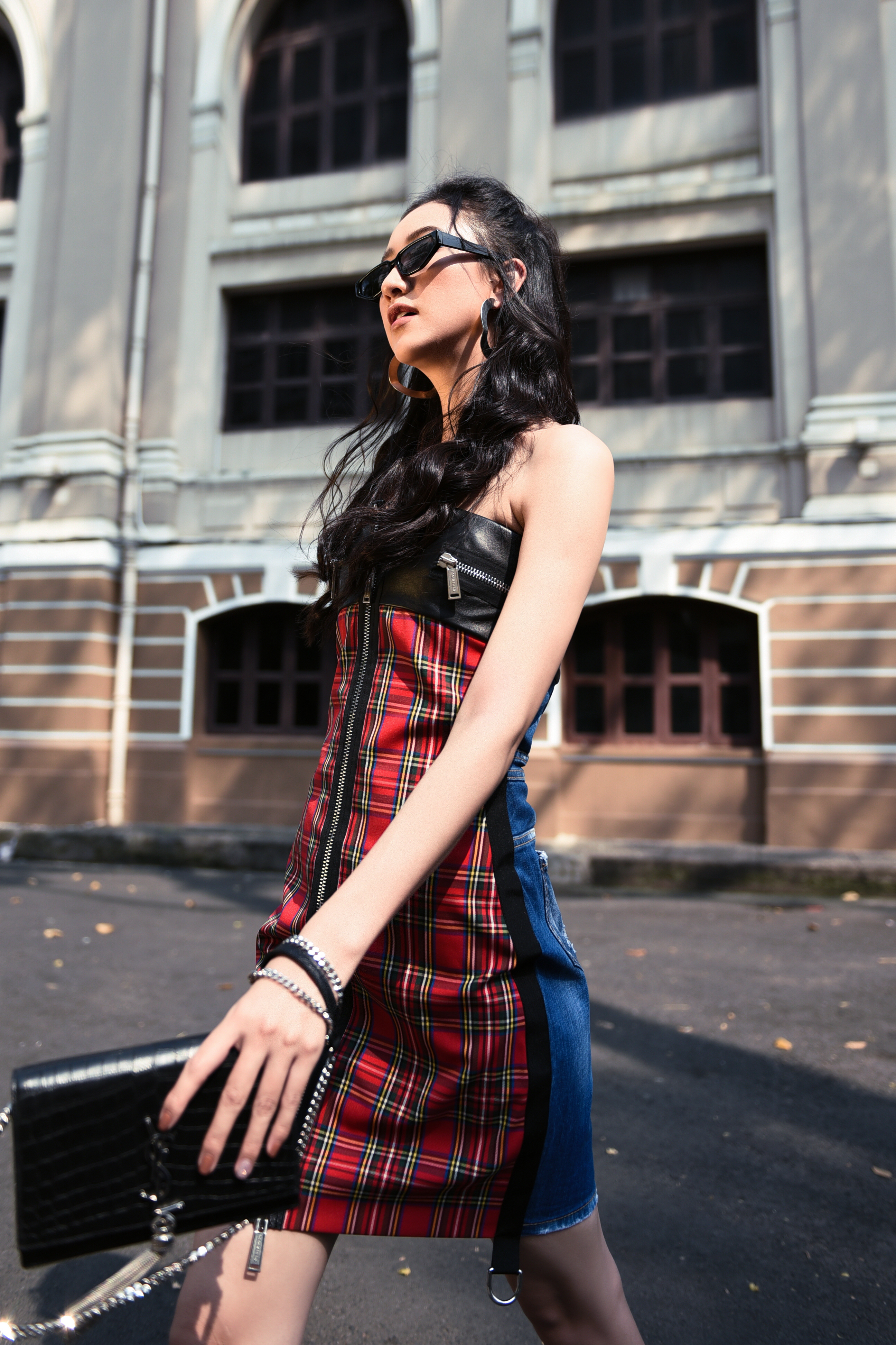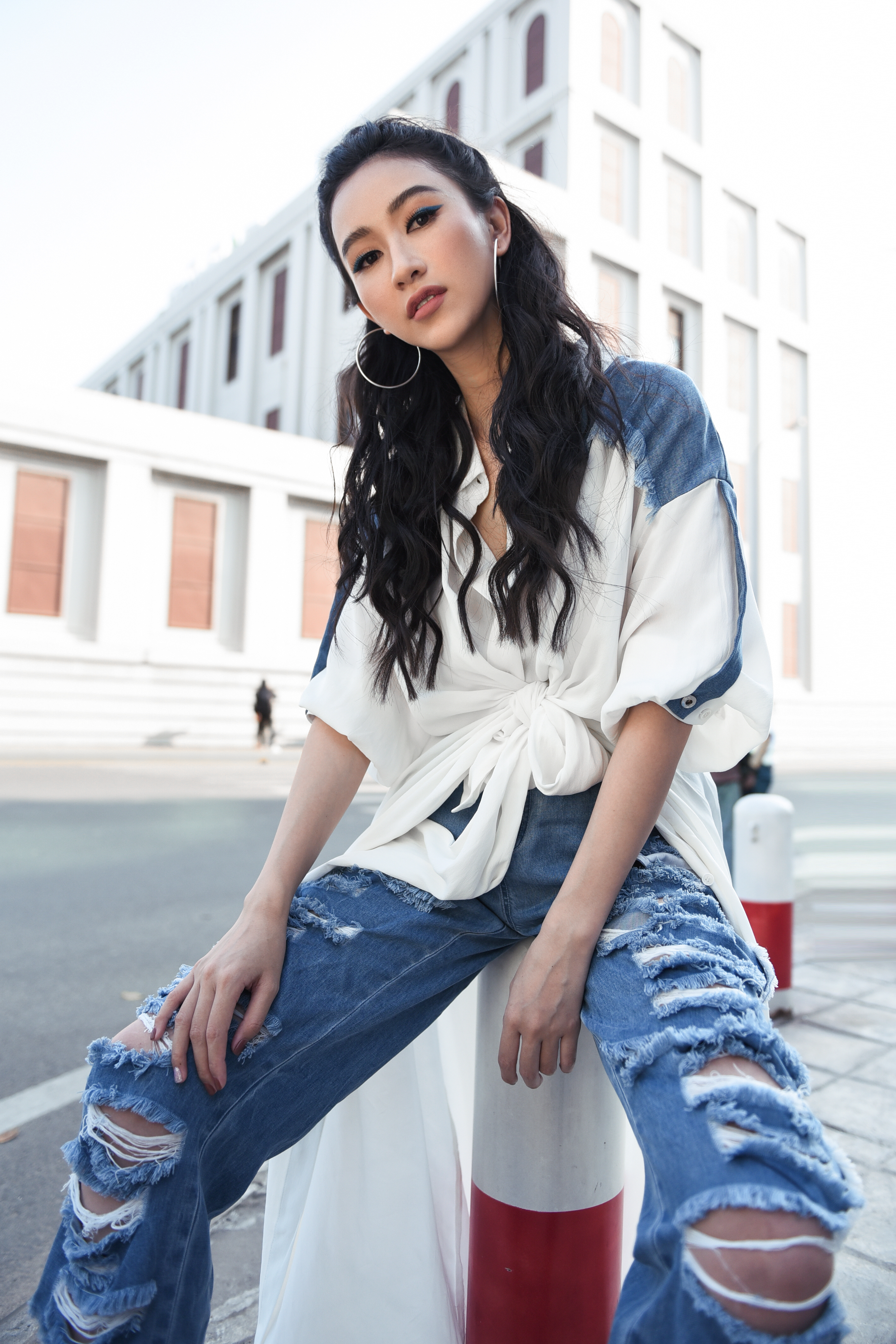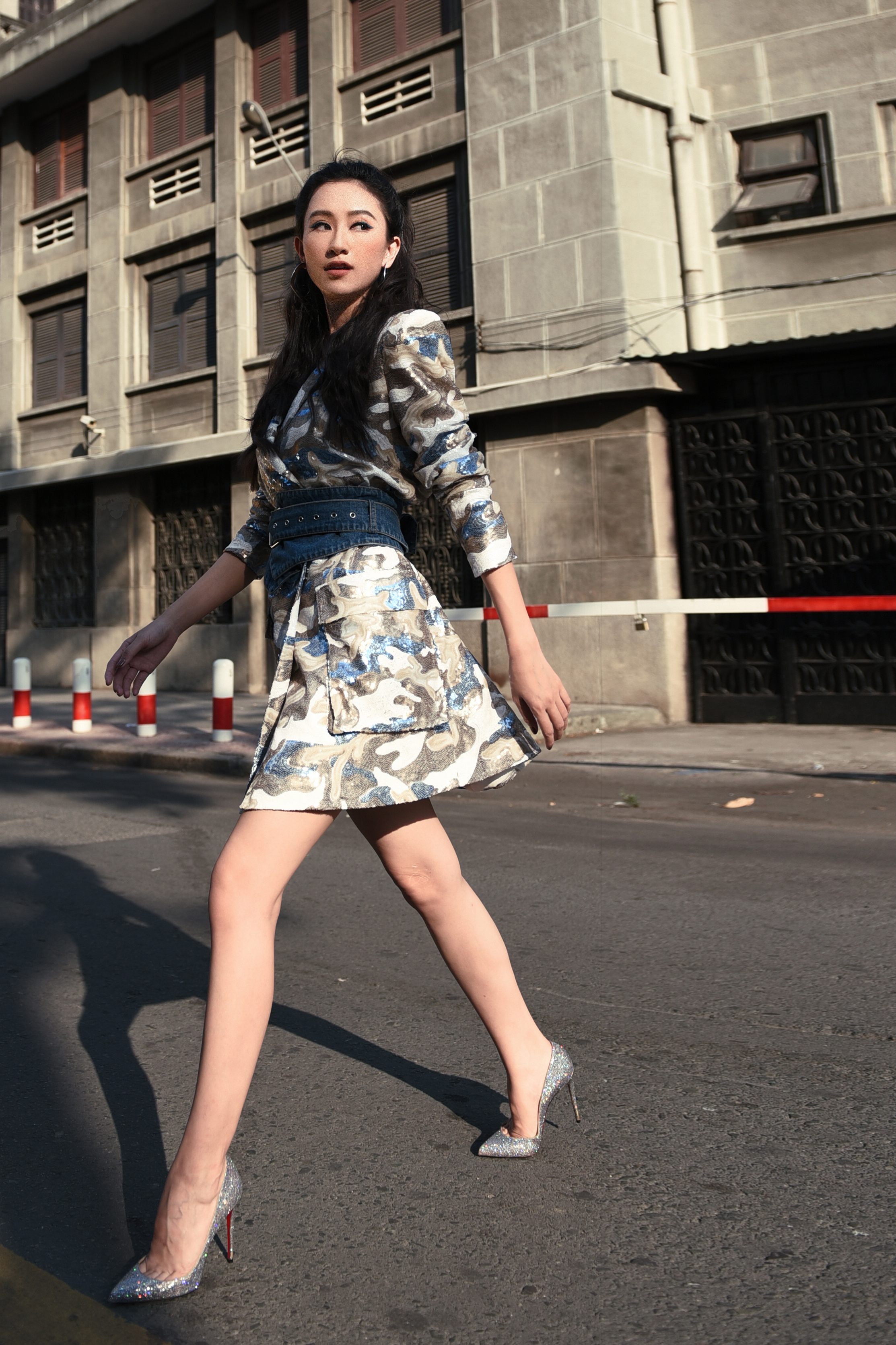Đây là một trong những items khó nhằn, dễ khiến người mặc trở thành “thảm họa”, nhưng nhờ chiều cao cùng dáng vóc cân đối, mọi thứ lại có vẻ vừa vặn khi ướm lên người Hà Thu.