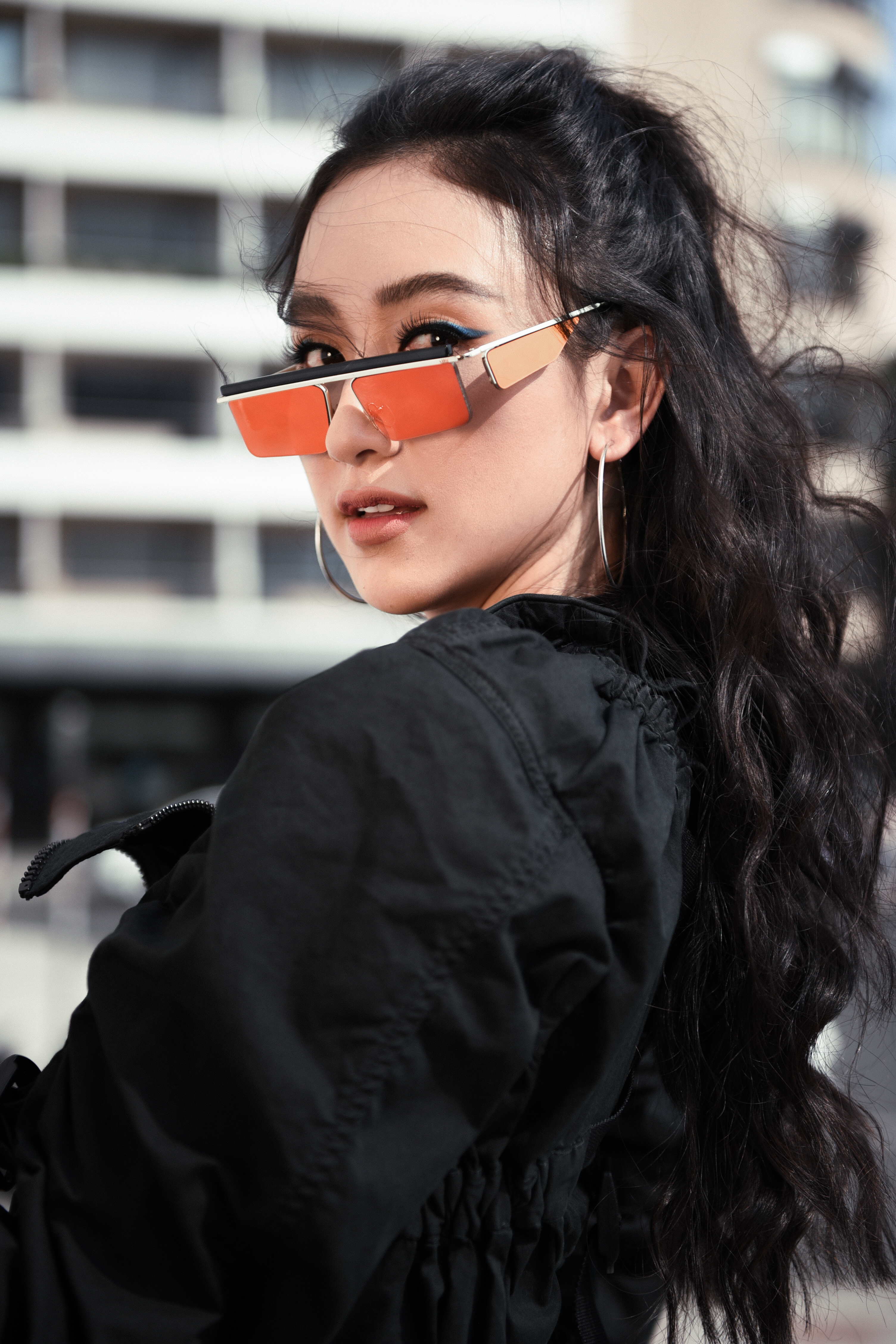 Cô nàng cũng không quên điểm xuyết thêm phụ kiện mắt kính bản nhỏ với tông đỏ làm tăng điểm ấn tượng.