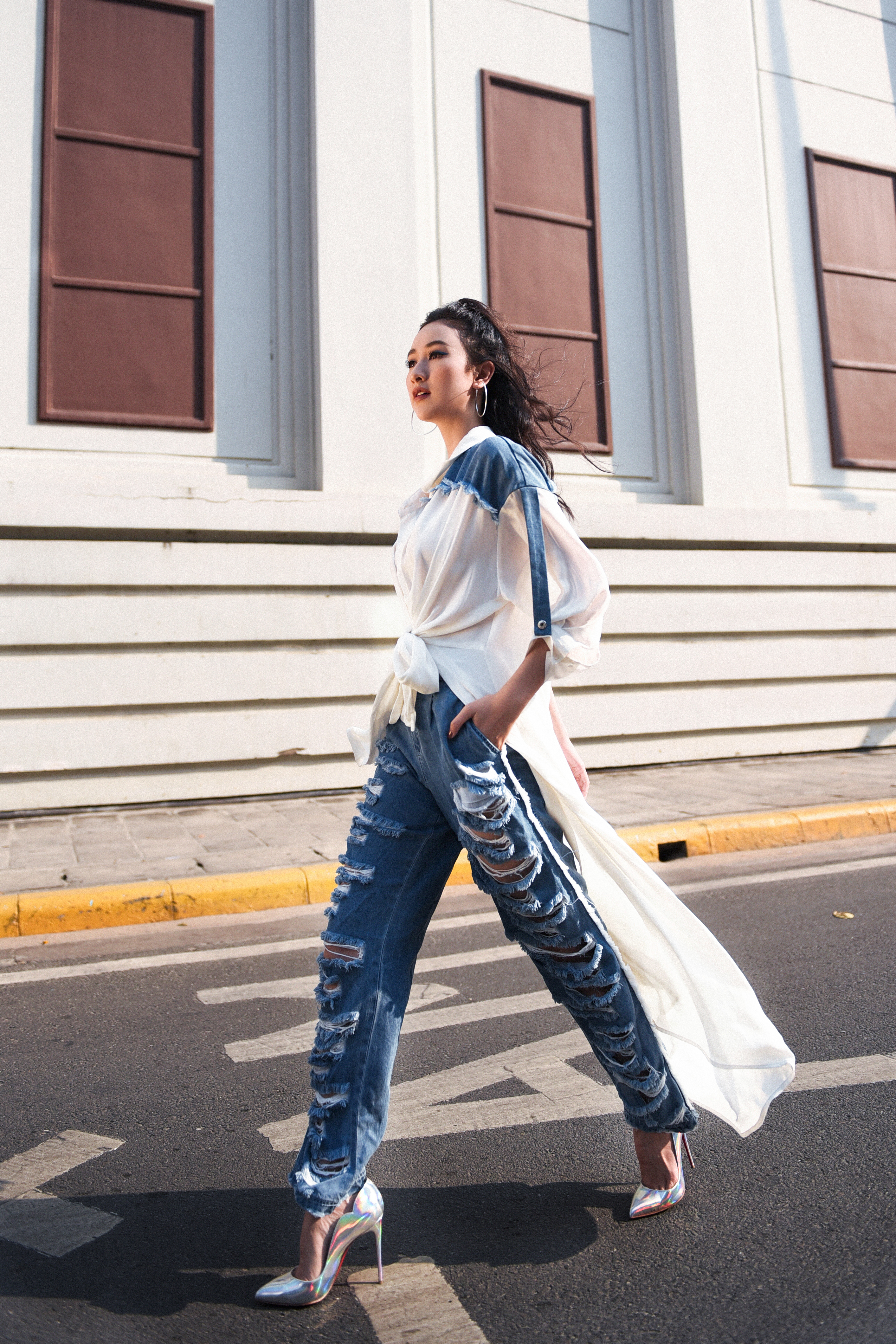 Quần jeans phom rộng rách cùng áo dáng dài bụi bặm là set đồ tiếp theo mà người đẹp chọn diện.