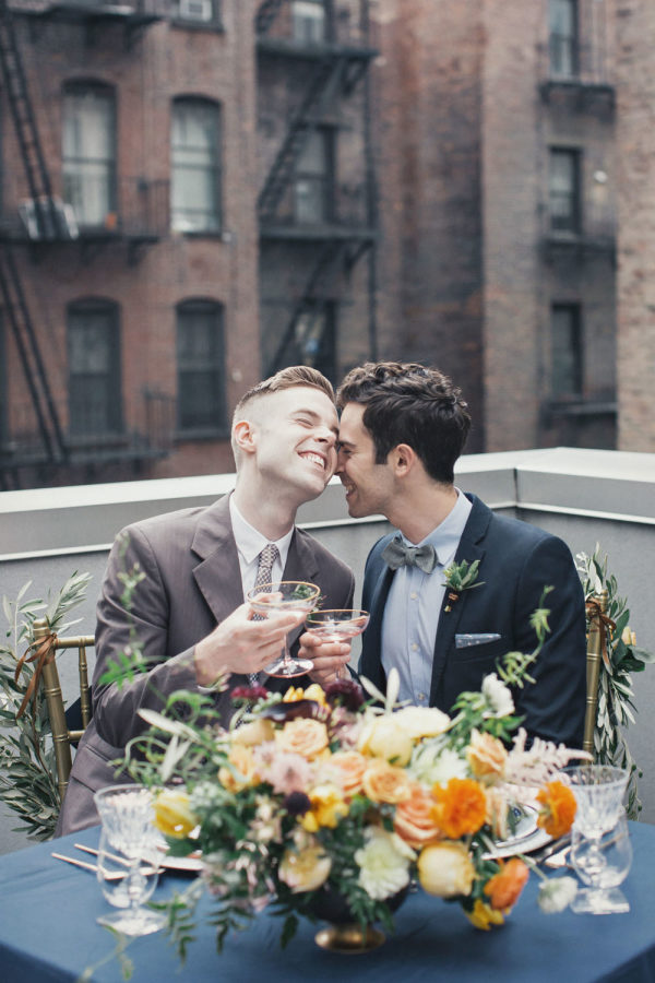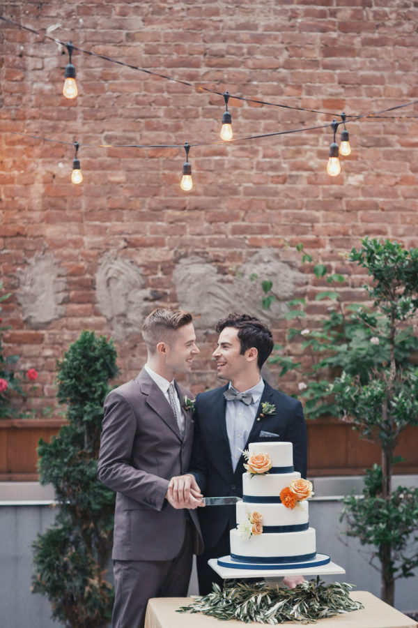 Hai bộ suite được lấy ý tưởng từ hình ảnh trên đại lộ Madison những năm 1950 với sắc xanh navy và nâu vàng được Andrew và Brian khoát lên nổi bật giữa không gian cổ điển. Bánh cưới được kết hoa hồng cam pha lẫn màu hột gà tượng trưng cho hạnh phúc ấm cúng trong ngày trọng đại của hai chú rễ.