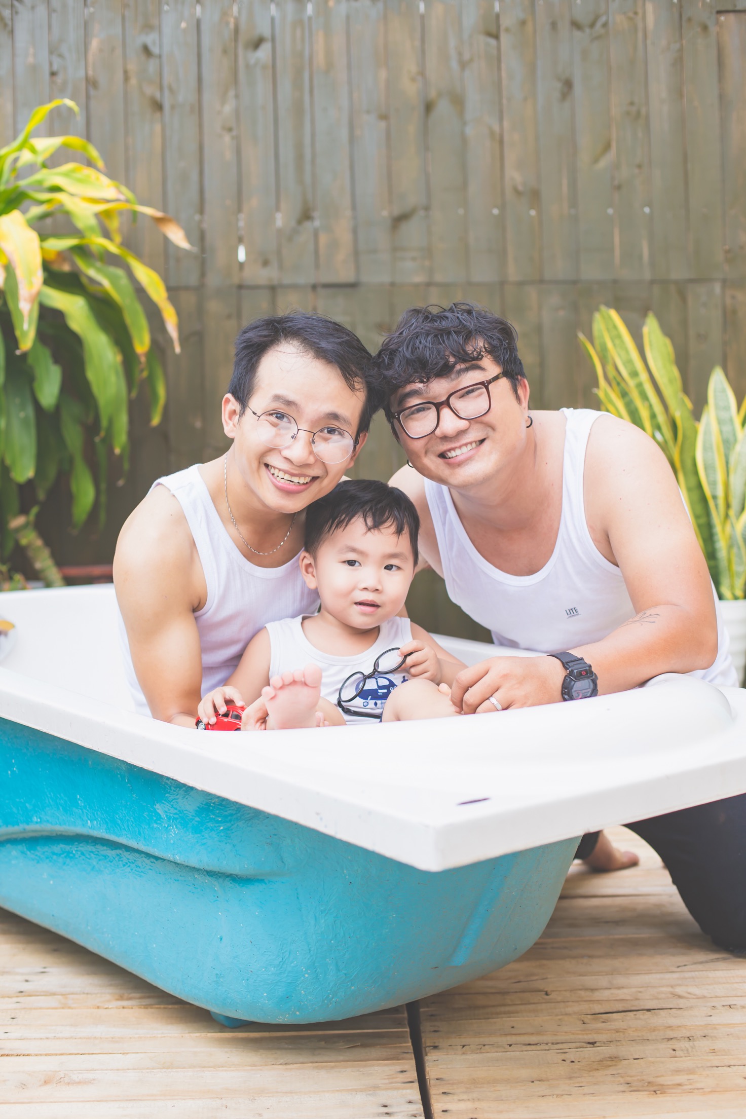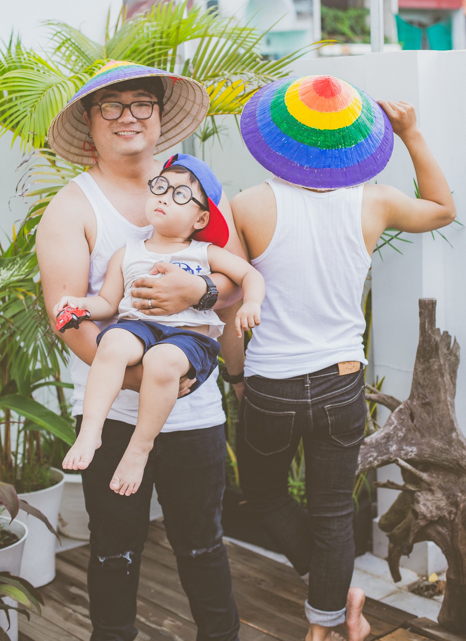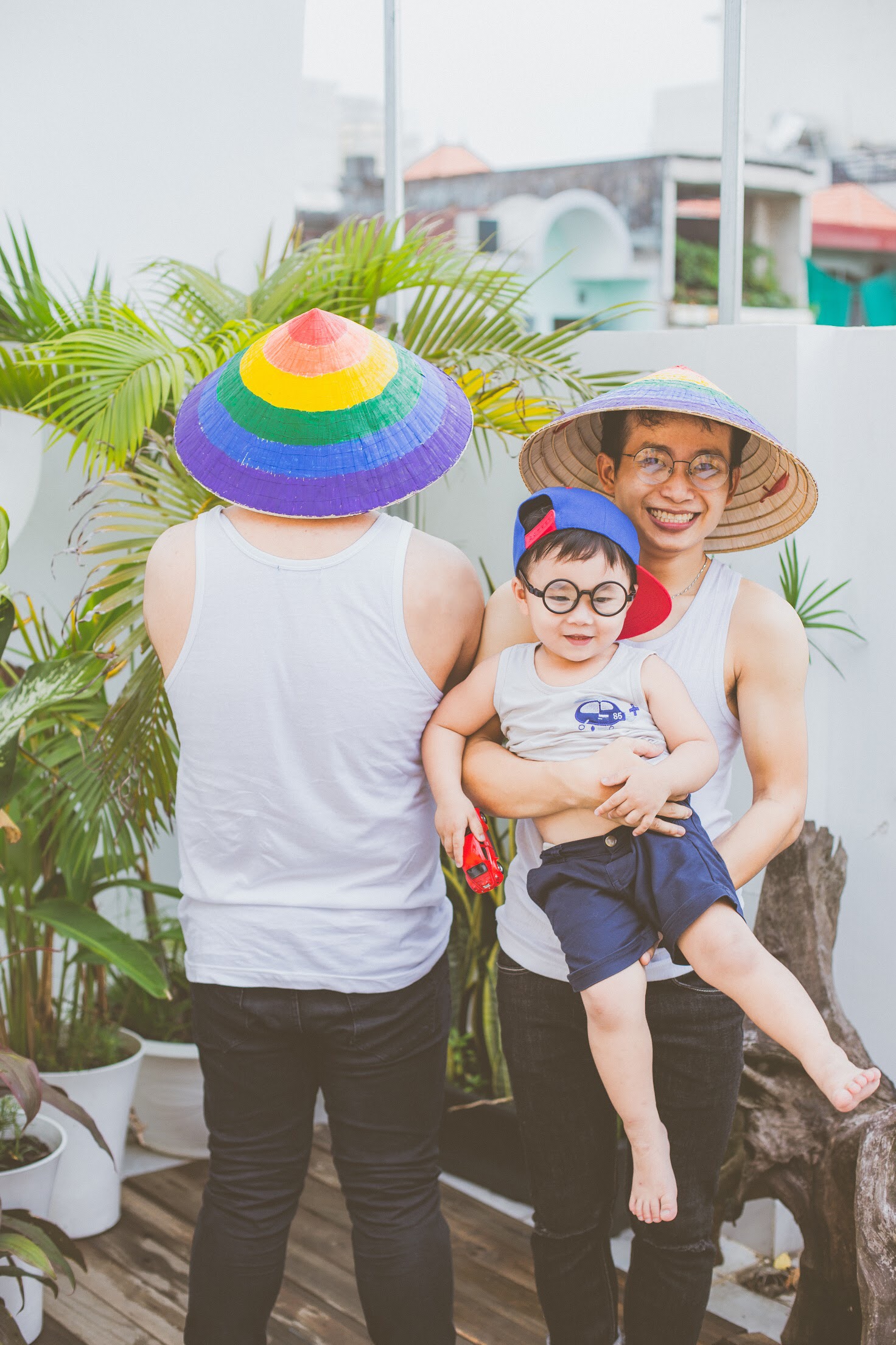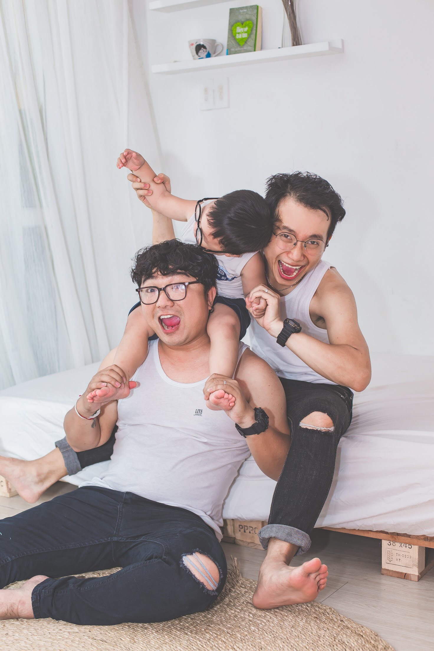 Trong ảnh là một cặp đôi đồng tính nam đang chơi đùa vui vẻ với một cậu bé con. Trong ánh mắt của cả hai đều lấp lánh niềm hạnh phúc.