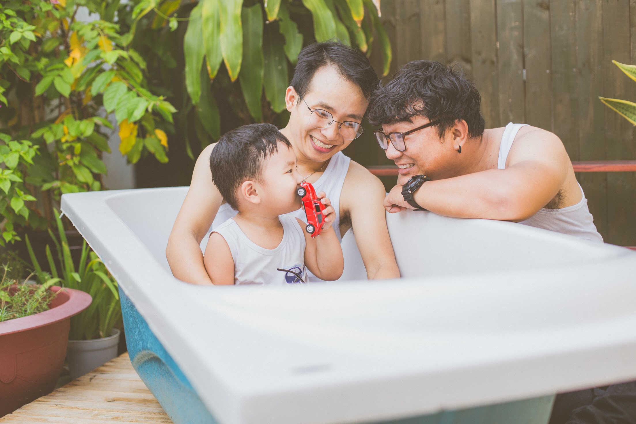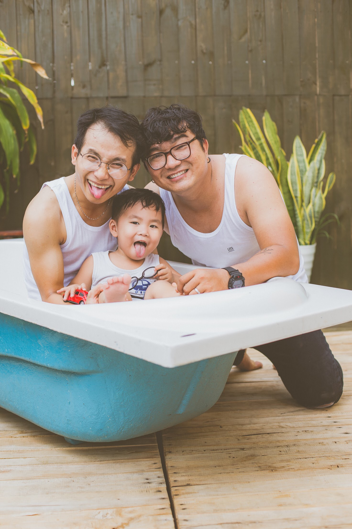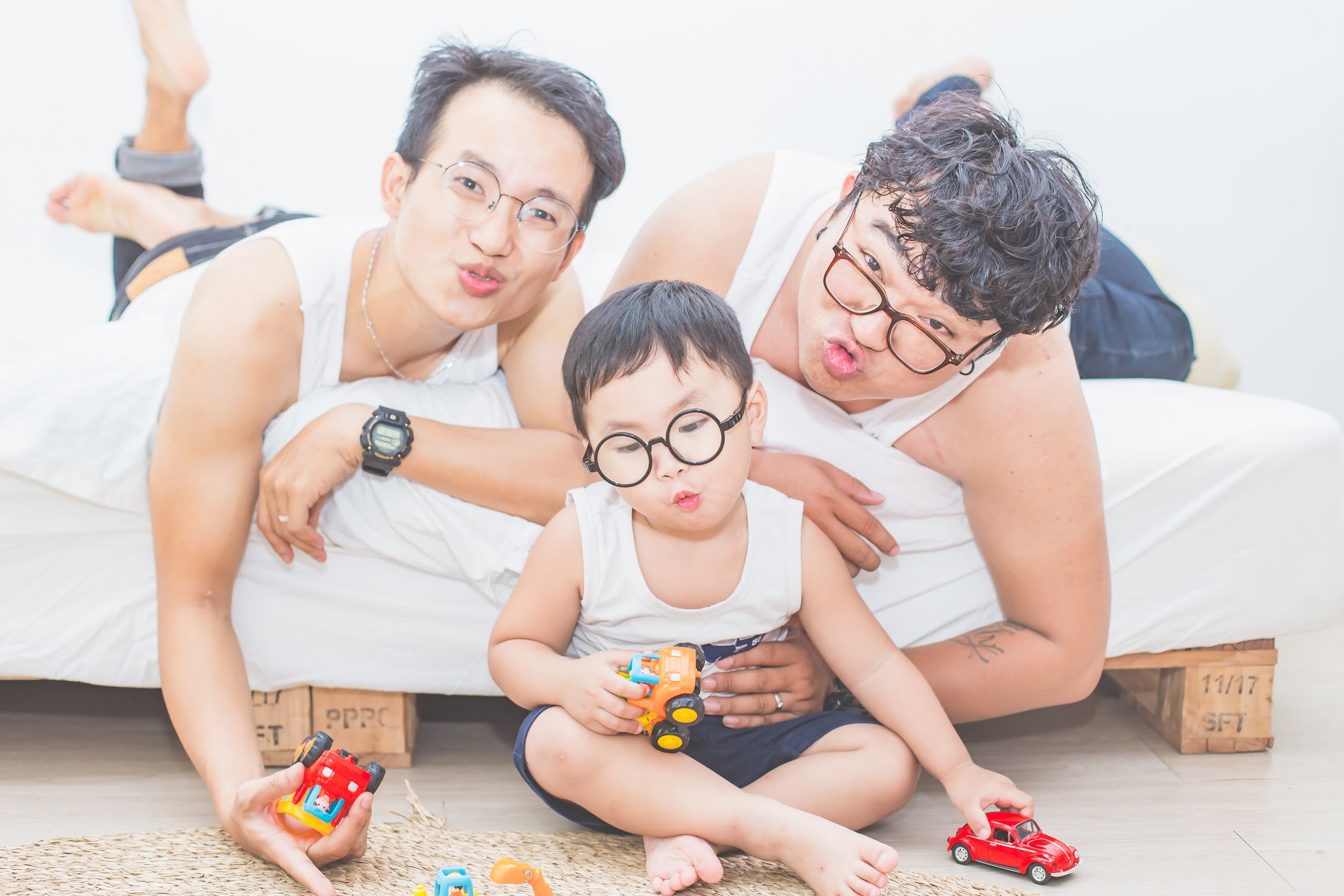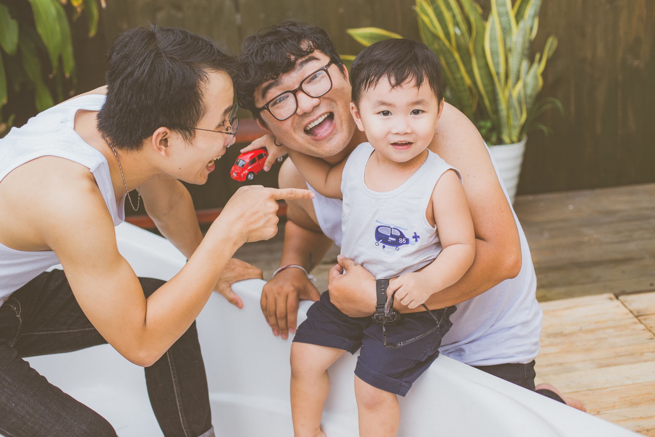 Trong ảnh là một cặp đôi đồng tính nam đang chơi đùa vui vẻ với một cậu bé con. Trong ánh mắt của cả hai đều lấp lánh niềm hạnh phúc.
