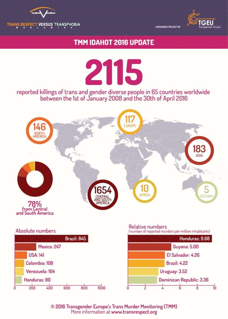 2115 người chuyển giới đã bị giết chết ở 65 quốc gia trên toàn thế giới từ tháng 1/2008 đến ngày 30/4/2016. Trong đó, số nạn nhân ở Brazil là 845 người