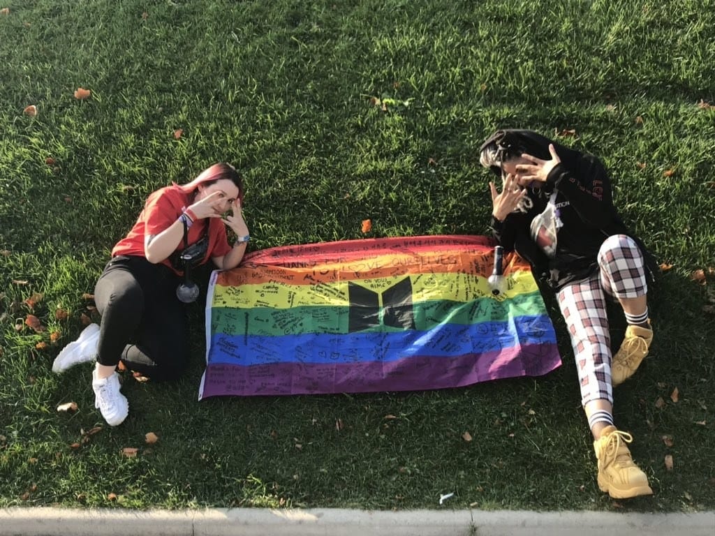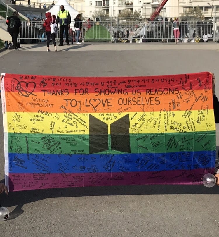 Trong concert tại Paris gần đây của nhóm, nữ bartender người Anh tên Karess Bollanga đã đem theo một lá cờ lục sắc có in logo BTS đến cổ vũ. Tấm hình chụp lá cờ được Karess và bạn bè mình chia sẻ lại trên mạng xã hội. Sau đó nhanh chóng nhận được sự chú ý của cộng đồng mạng quốc tế. Chia sẻ với tờ BuzzNews, lý do mà Karess làm điều này là vì cô muốn gửi lời cảm ơn đến các chàng trai và cho họ biết rằng họ là một trong những nguồn động lực lớn nhất của cộng đồng LGBT. Ý tưởng này đã nảy sinh khi cô đang lắng nghe bài hát solo “Stigma” của Taehyung trong album Wings.
