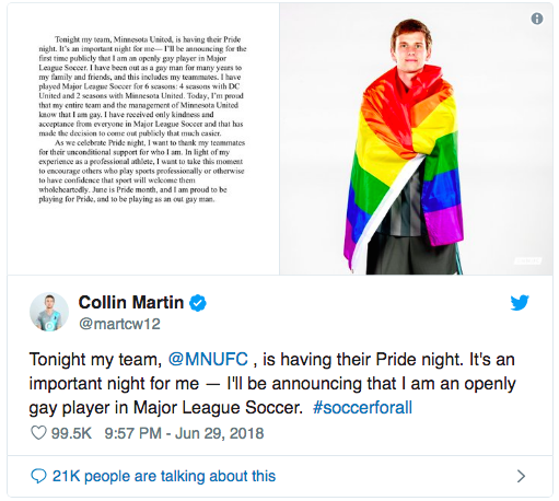 “Hôm nay, tôi tự hào đứng trước toàn bộ đồng đội của tôi và quản lý của Minnesota United biết rằng tôi là gay”, Martin đã viết trong một tin nhắn trên Twitter. “Tôi đã nhận được lòng tốt và sự chấp nhận từ mọi người trong Major League Soccer và điều đó đã đưa ra quyết định công khai dễ dàng hơn nhiều.”